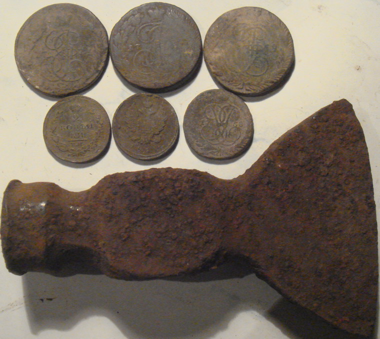 особо не порадовал коп,подковы,и похоже на кошель что то, монеты по обрыву ростянуты были,решили склон пробить,так мел так размяк,что ходить не возможно,скользко Оставили затею поиска клада,как просохнет Удивили монеты двухи 1811года,вмести с пятаками Катиными ходили Что ли? Топор позняковый вроде кузнечный,рядом тоже валялся Вложенные эскизы изображений -------------------- Дары приносящих,затмевают глаза мудрых....
