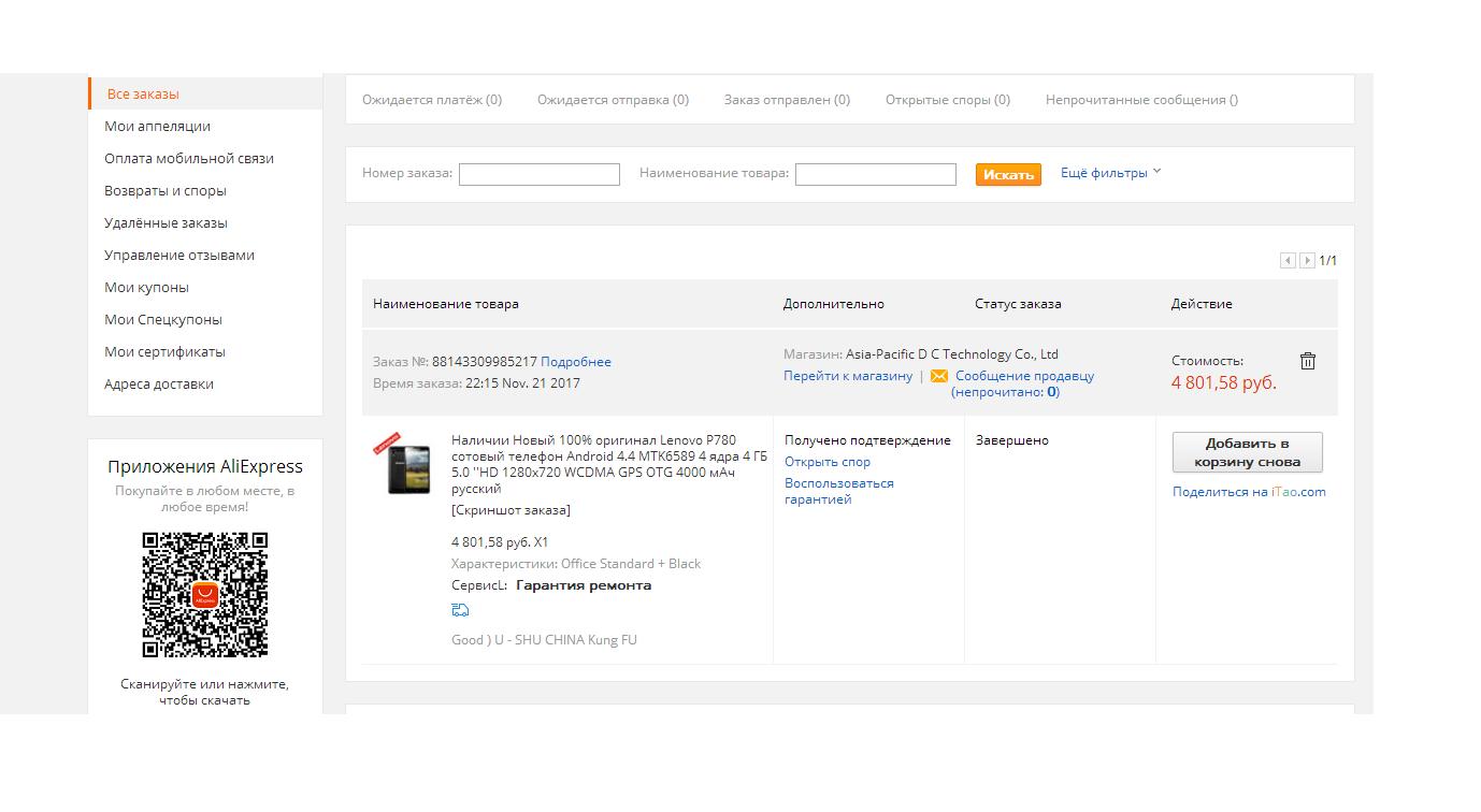 Покупка смартфона Lenovo P780 на Али экспресс 21.11.2017г