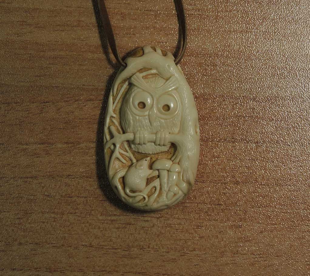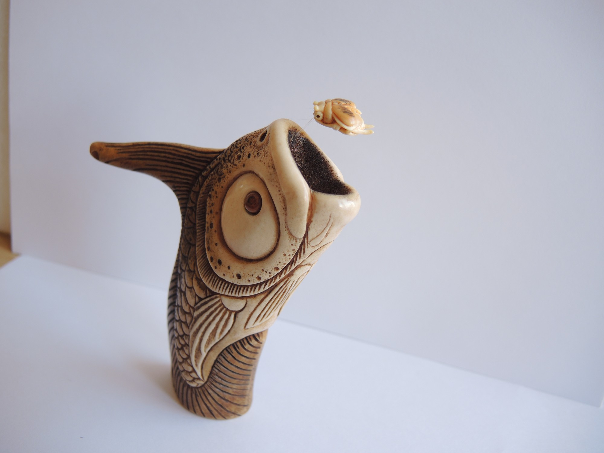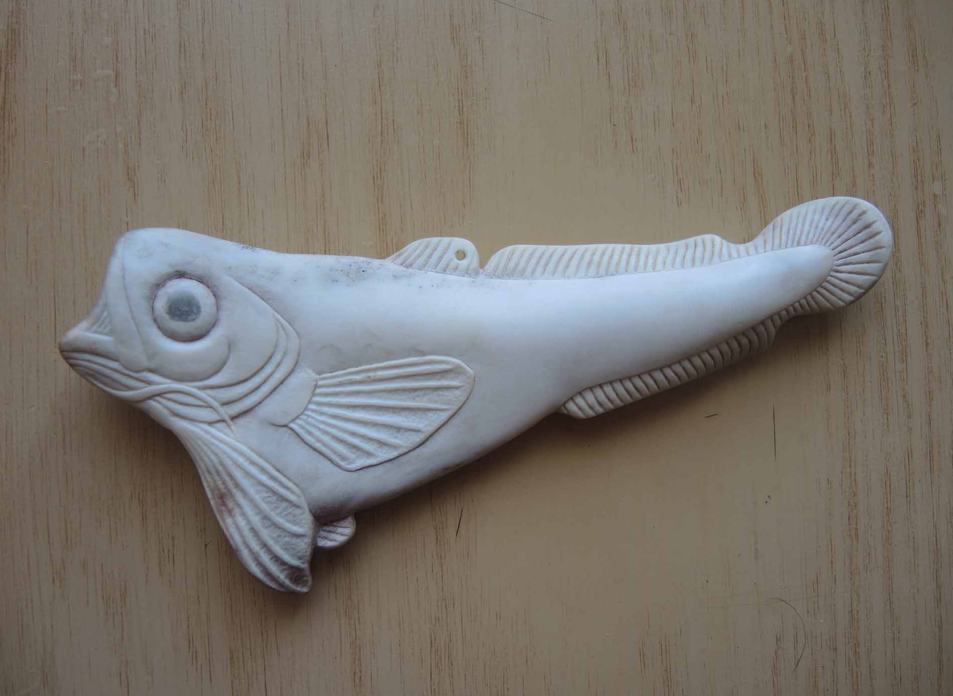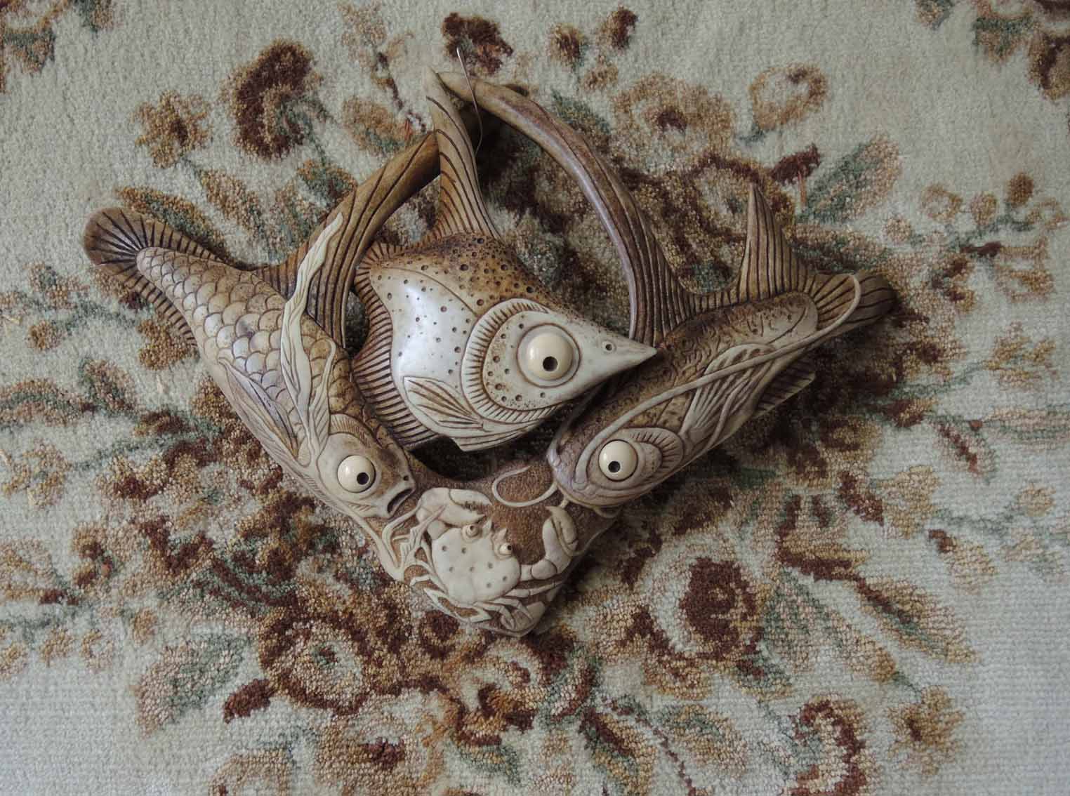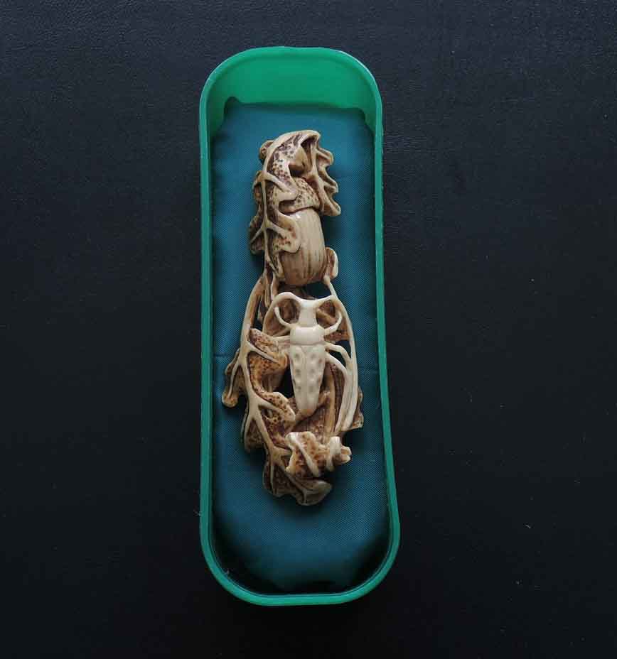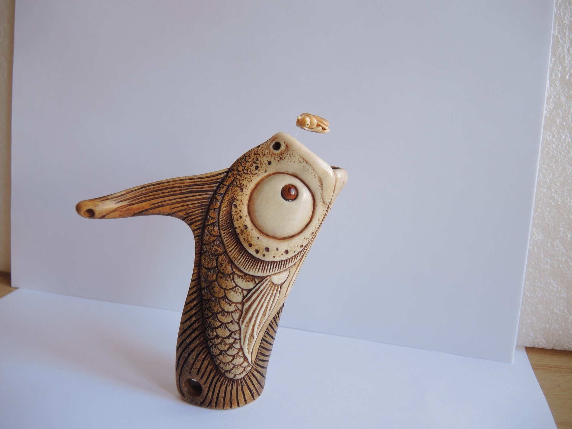 - но с этой композицией всё случайно вышло: сначала лежал себе кусок рога, можно было ручку для ножа, но - толстовата и при этой толщине надо бы подлиннее тогда. Ну а потом клинок соответствующий, я же не Макаренков, всяких таких заготовок и приспособ у меня нет, да и вообще как бы не совсем мой профиль, хотя, в своё время изготовлением ножей как-бы увлекался. Ну вот. Резать на куски - ну и что это будет - всё равно толсто дело и на брелок и на украшение. Хотя... можно разве что брелок брутальный - жалко такой редкий для северного нанего оленя расчленять. Короче, начал скыркать - а там уж видно, что получится, это типа шаловливые ручки покоя не давали. Ну а вышла рыбина, плавник укорачивать не стал, из разряда брелков с таким зацепом поделка выпадала, получилась. Пришлось делать двухстороннюю, вторую сторону вырезал немного другой, затонировал ... ну не акимоно же - надо чего нибудь впереди в виде как-бы цели сделать. Порылся в огрызках бивня, нашёл такой вот хорошего качества, но скажем так - тонкий, мм 7, наверное с коркой. Снял лишнее - стало тоньше- это и определило размер жучка. Ты ж понимаешь, что если всё по уму и был объёмный кусочек материала, то лапки бы задние надо было подсвесить, да и боковые, чтобы он висел на крылышках. По при заданной толщине этого не получалось, в общем, вышло то, что вышло Займусь на досуге дожимом фоток, были ещё и с панно и с этой поделкой в подвешенном виде. Дырка сзади осталась для антуражу |