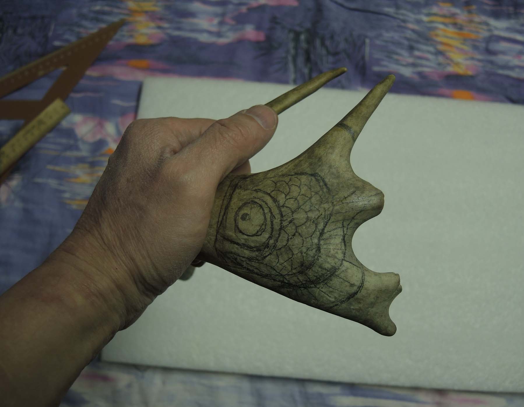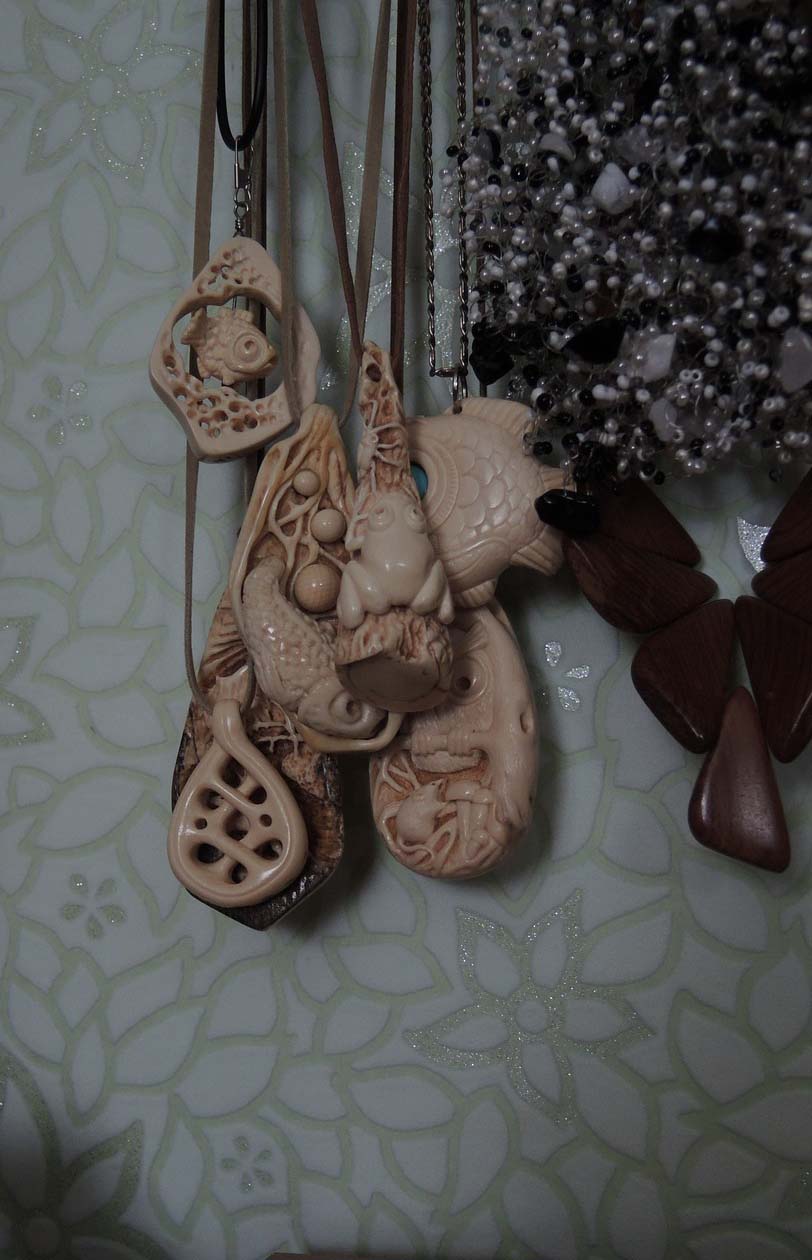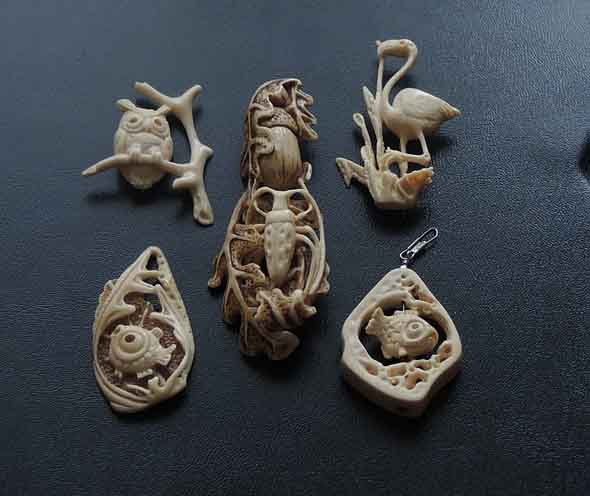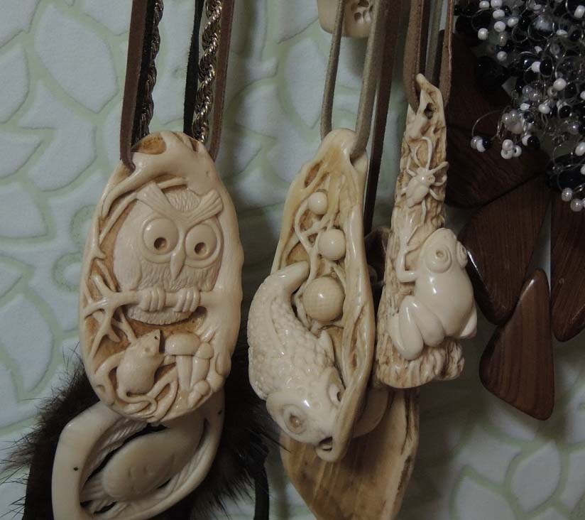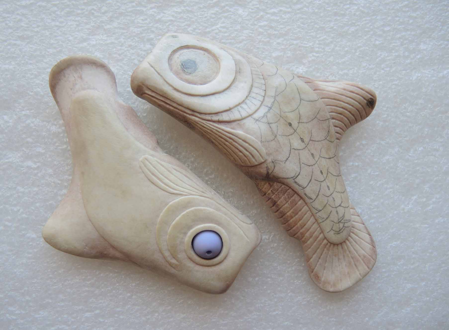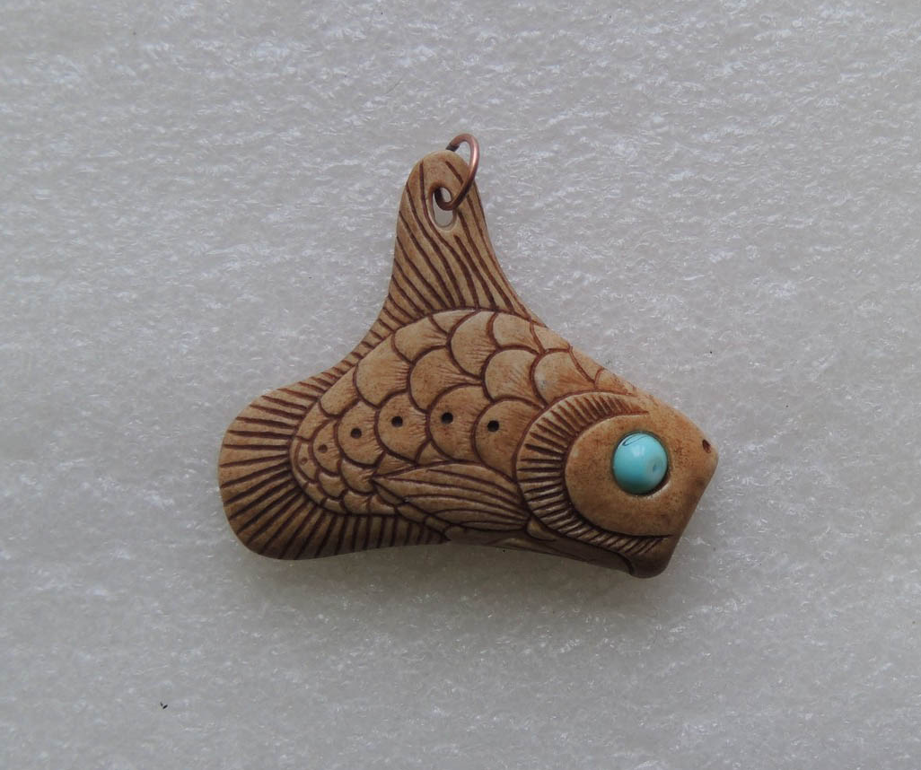 - но с этой композицией всё случайно вышло: сначала лежал себе кусок рога, можно было ручку для ножа, но - толстовата и при этой толщине надо бы подлиннее тогда. Ну а потом клинок соответствующий, я же не Макаренков, всяких таких заготовок и приспособ у меня нет, да и вообще как бы не совсем мой профиль, хотя, в своё время изготовлением ножей как-бы увлекался. Ну вот. Резать на куски - ну и что это будет - всё равно толсто дело и на брелок и на украшение. Хотя... можно разве что брелок брутальный - жалко такой редкий для северного нанего оленя расчленять. Короче, начал скыркать - а там уж видно, что получится, это типа шаловливые ручки покоя не давали. Ну а вышла рыбина, плавник укорачивать не стал, из разряда брелков с таким зацепом поделка выпадала, получилась. Пришлось делать двухстороннюю, вторую сторону вырезал немного другой, затонировал ... ну не акимоно же - надо чего нибудь впереди в виде как-бы цели сделать. Порылся в огрызках бивня, нашёл такой вот хорошего качества, но скажем так - тонкий, мм 7, наверное с коркой. Снял лишнее - стало тоньше- это и определило размер жучка. Ты ж понимаешь, что если всё по уму и был объёмный кусочек материала, то лапки бы задние надо было подсвесить, да и боковые, чтобы он висел на крылышках. По при заданной толщине этого не получалось, в общем, вышло то, что вышло Займусь на досуге дожимом фоток, были ещё и с панно и с этой поделкой в подвешенном виде. Дырка сзади осталась для антуражу |