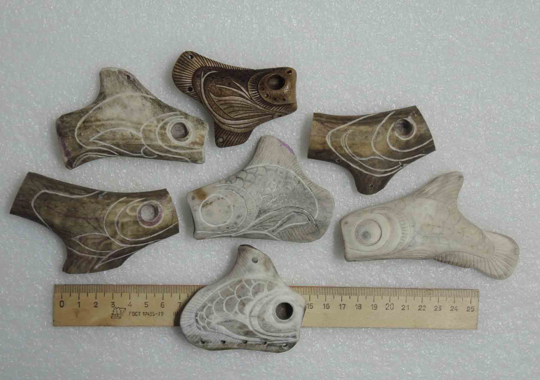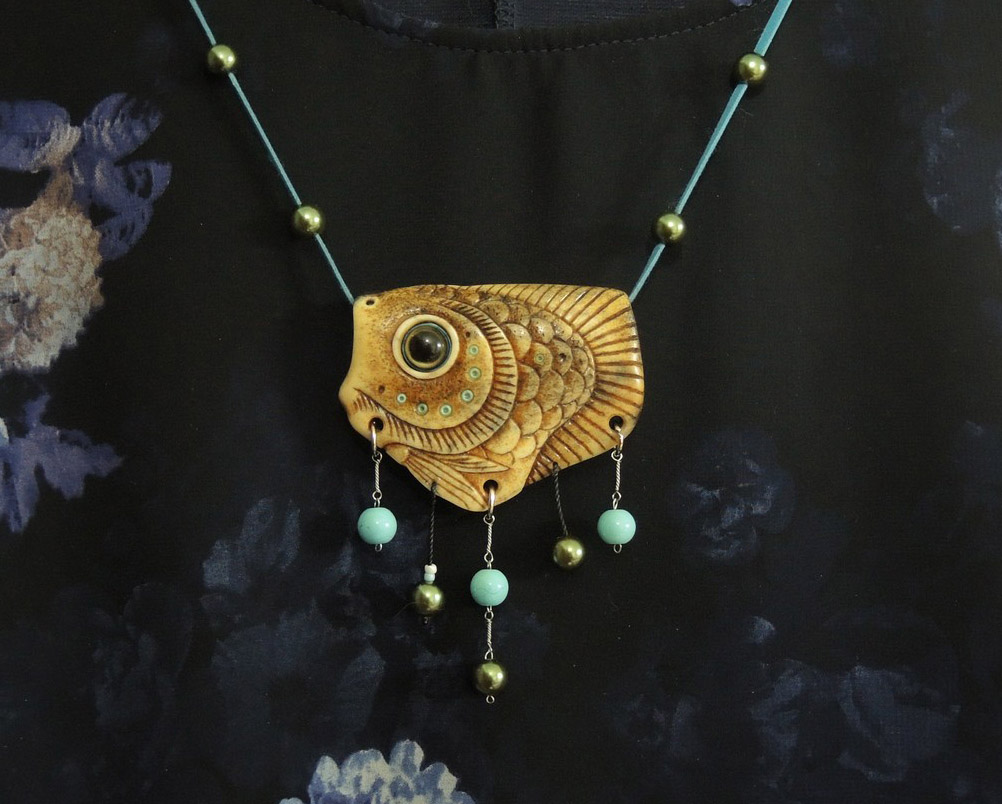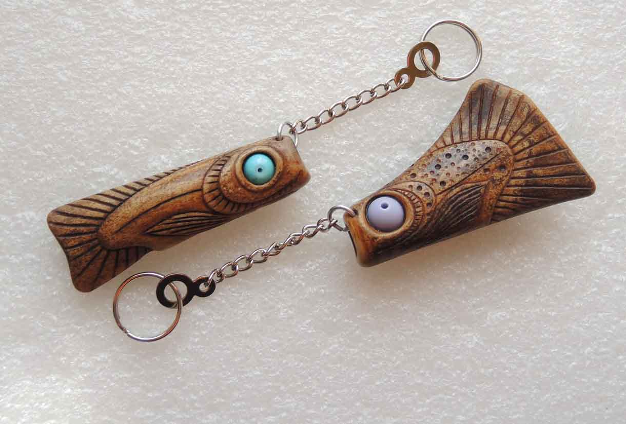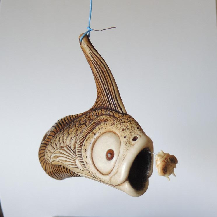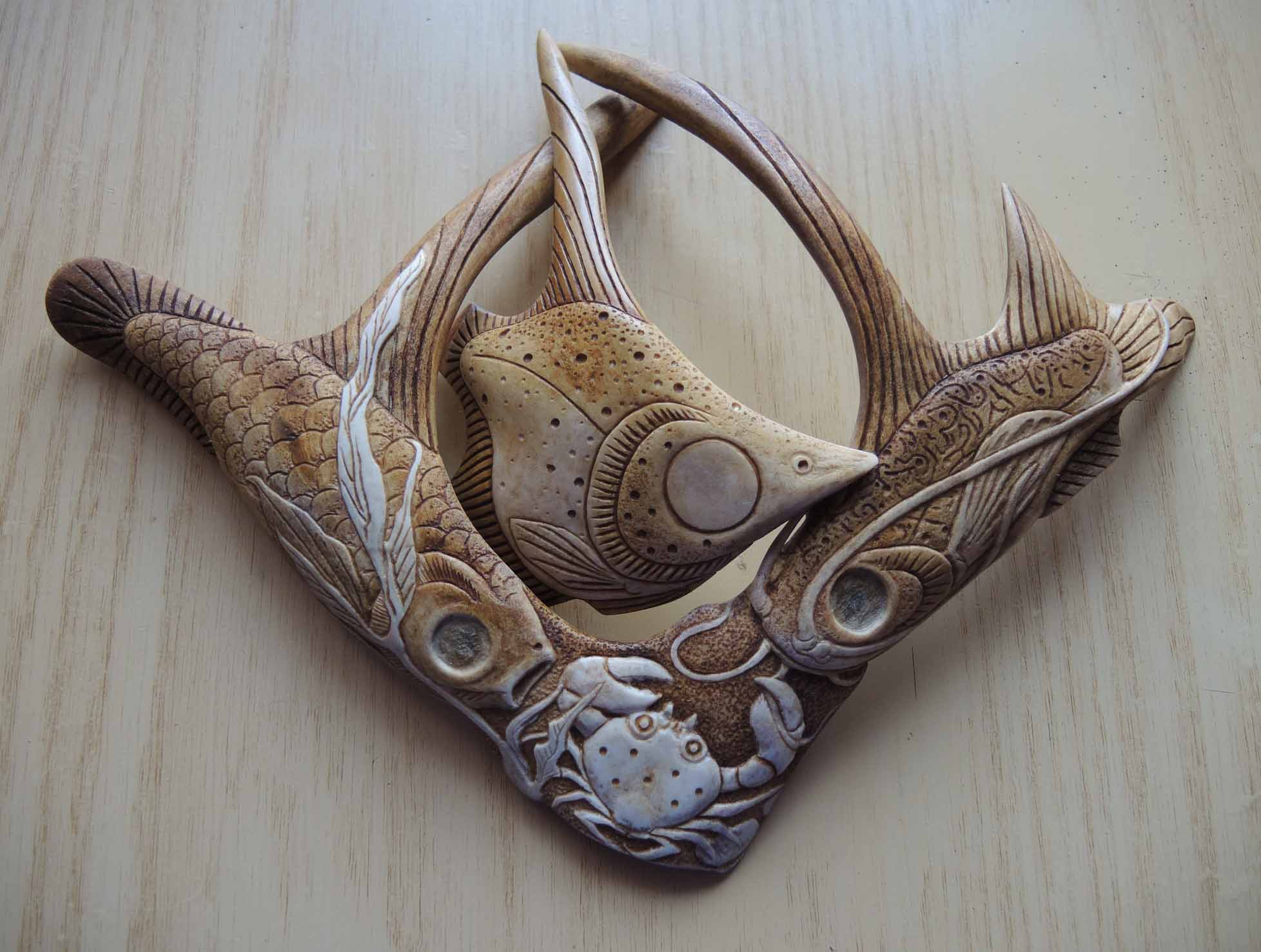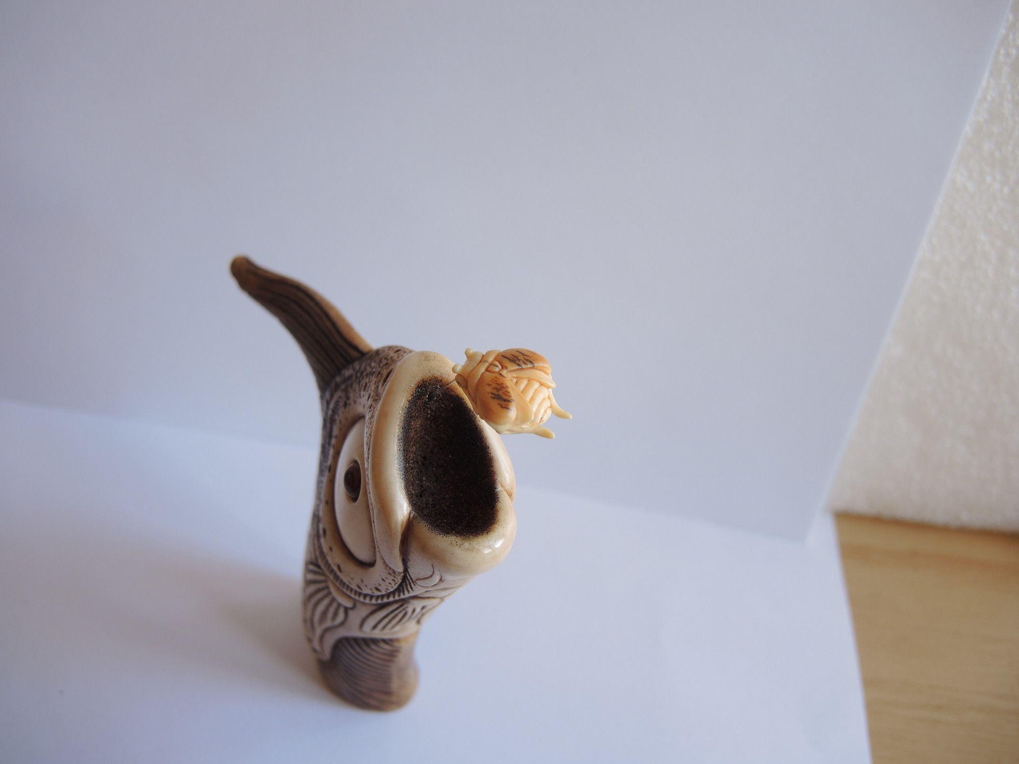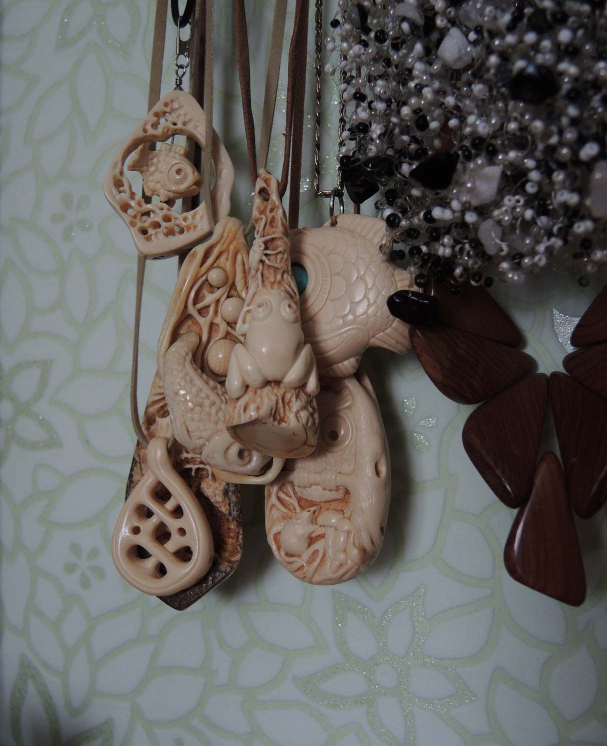 - но с этой композицией всё случайно вышло: сначала лежал себе кусок рога, можно было ручку для ножа, но - толстовата и при этой толщине надо бы подлиннее тогда. Ну а потом клинок соответствующий, я же не Макаренков, всяких таких заготовок и приспособ у меня нет, да и вообще как бы не совсем мой профиль, хотя, в своё время изготовлением ножей как-бы увлекался. Ну вот. Резать на куски - ну и что это будет - всё равно толсто дело и на брелок и на украшение. Хотя... можно разве что брелок брутальный - жалко такой редкий для северного нанего оленя расчленять. Короче, начал скыркать - а там уж видно, что получится, это типа шаловливые ручки покоя не давали. Ну а вышла рыбина, плавник укорачивать не стал, из разряда брелков с таким зацепом поделка выпадала, получилась. Пришлось делать двухстороннюю, вторую сторону вырезал немного другой, затонировал ... ну не акимоно же - надо чего нибудь впереди в виде как-бы цели сделать. Порылся в огрызках бивня, нашёл такой вот хорошего качества, но скажем так - тонкий, мм 7, наверное с коркой. Снял лишнее - стало тоньше- это и определило размер жучка. Ты ж понимаешь, что если всё по уму и был объёмный кусочек материала, то лапки бы задние надо было подсвесить, да и боковые, чтобы он висел на крылышках. По при заданной толщине этого не получалось, в общем, вышло то, что вышло Займусь на досуге дожимом фоток, были ещё и с панно и с этой поделкой в подвешенном виде. Дырка сзади осталась для антуражу |