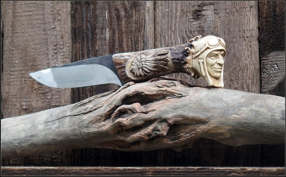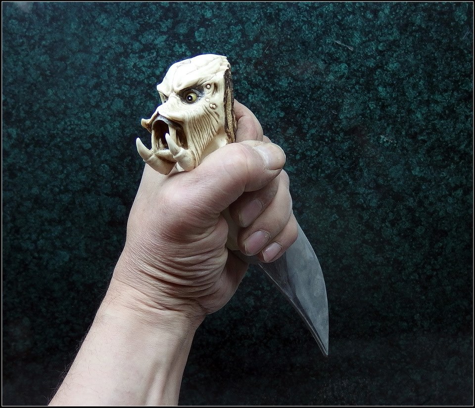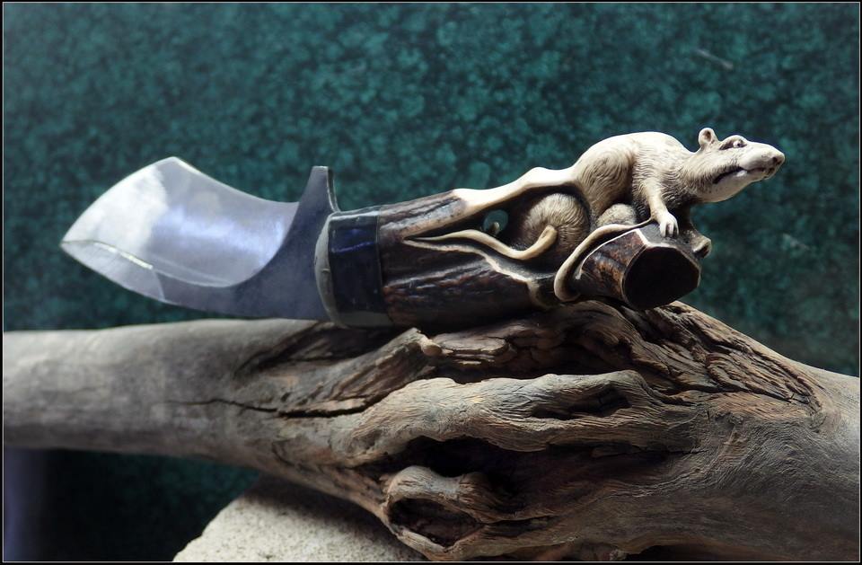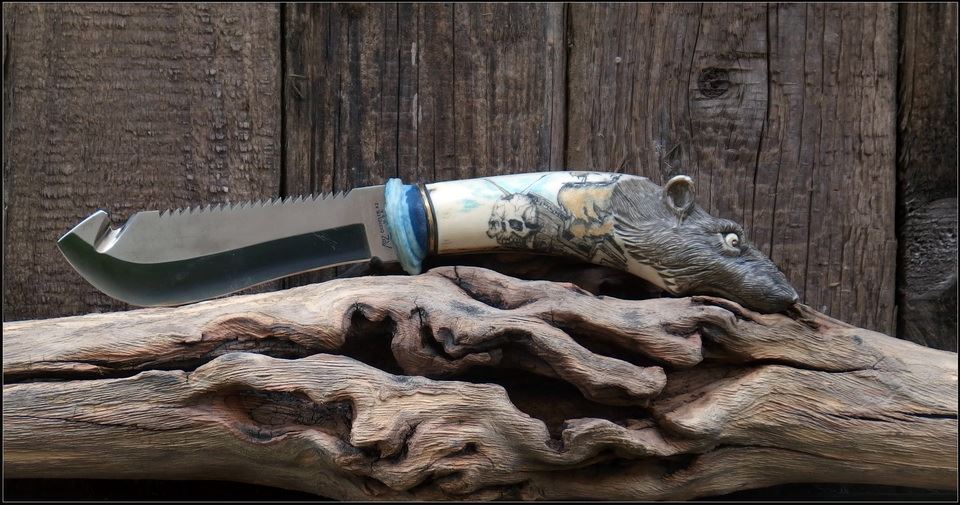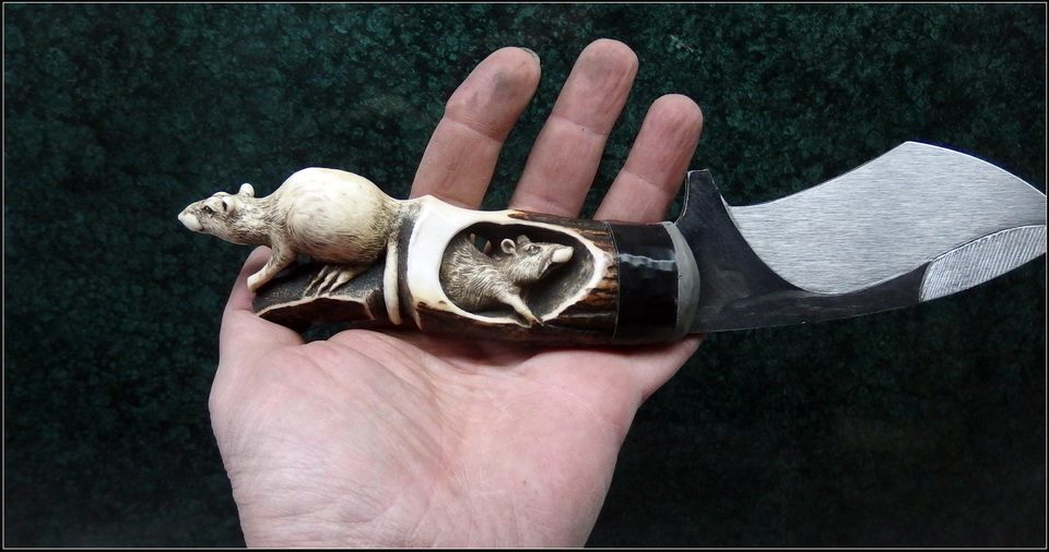 -..................На самом деле мне сложно ответить на этот вопрос. Возможно работа с исконно природными материалами и органикой в моём понимании не слишком согласуется с временными техническими проявлениями и увлечениями. Наверное, я не слишком идеализирую коп, чтобы делать ему такие "памятники". Сложно сказать, я над этим не задумывался. У меня была большая и довольно насыщенная жизнь и я много чем увлекался, но всё так или иначе- проходяще и, в лучшем случае, увековечено лишь в моей памяти. или так: Я искренне увлекался и любил многих женщин, и если бы даже их иена не написал на своём теле и не стал от того пёстро-синим от сплошных татуировок, мне всё равно, спустя годы, было бы неловко ворошить эту тему, поскольку многое поменялось, да и на тех дам и свои увлечения ими я уже смотрю совсем по другому. Да даже свои старые фотографии как-то неловко перебирать. Рыбки и букашки из рога и бивня тем и хороши, по моему мнению, что не несут сильной смысловой нагрузки, в них нет клятвы верности чему-то или какой-то задаче, религии или - опять же часто проходящему увлечению. Да,... не просто сформулировать то, о чём никогда не думал до сих пор Ну, в общем, у каждого мастера это всё индивидуально. Но если Вам интересны мотивы копа, воплощённые в бивне, то что далеко ходить - вот он, Сергей, который подкинул на днях в тему горсть ножей. Резчик со стажем, с головой, как говорится, широко известный в узких кругах, с работами, среди которых были и по теме копа. Просто здесь совсем иной профиль и иная платформа, по сему аудитория интересующихся весьма не велика и, если не поддерживать тему "на плаву" постоянными обновлениями (что не реально), то она рискует кануть непонятно куда и навсегда. Собственно и эта тема "на плаву" пока разбираю фотоархивы. Как нечего будет выкладывать она тоже пропадёт с глаз и забудется. Всё по Эклисиасту- всё куда-то движется и всё, как всегда, неизменно. То есть по сути бренно. Ну а пока... каждый человек, осознающий, что жизнь его не безконечна и бренна и каждый художник, понимающий и надеющийся, что его холсты будут смотреть в лучшем случае после его смерти, и даже каждый человек, написавший прекраснейшую книгу (правда, не на бумаге, а всего лишь в своей голове)... пусть в этой атмосфере недосказанности, нереализованности и даже несамопонимания где то по миру плывут простые и незатейливые, не несущие смысловой нагрузки рыбки. Ну, хотя бы типа этих... Вложенные эскизы изображений |