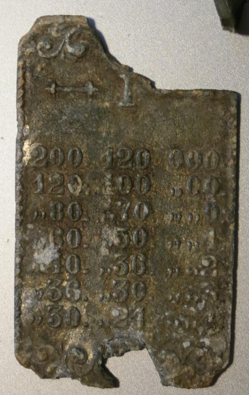 Вот ни когда бы не подумал! Спасибо. Была мысль что это шильдик с таблицей стрельбы, т.к. рядом найден осколк ядра, пули того времени, пуговица мундира. Мы с напрником назвали это место Домик солдата, предполагая что там жил отставной военный нижнего чина времён ПетраI. Разумеется керамика того времени и кое-какая бытовуха того времени и ничего более позднего перьюда.