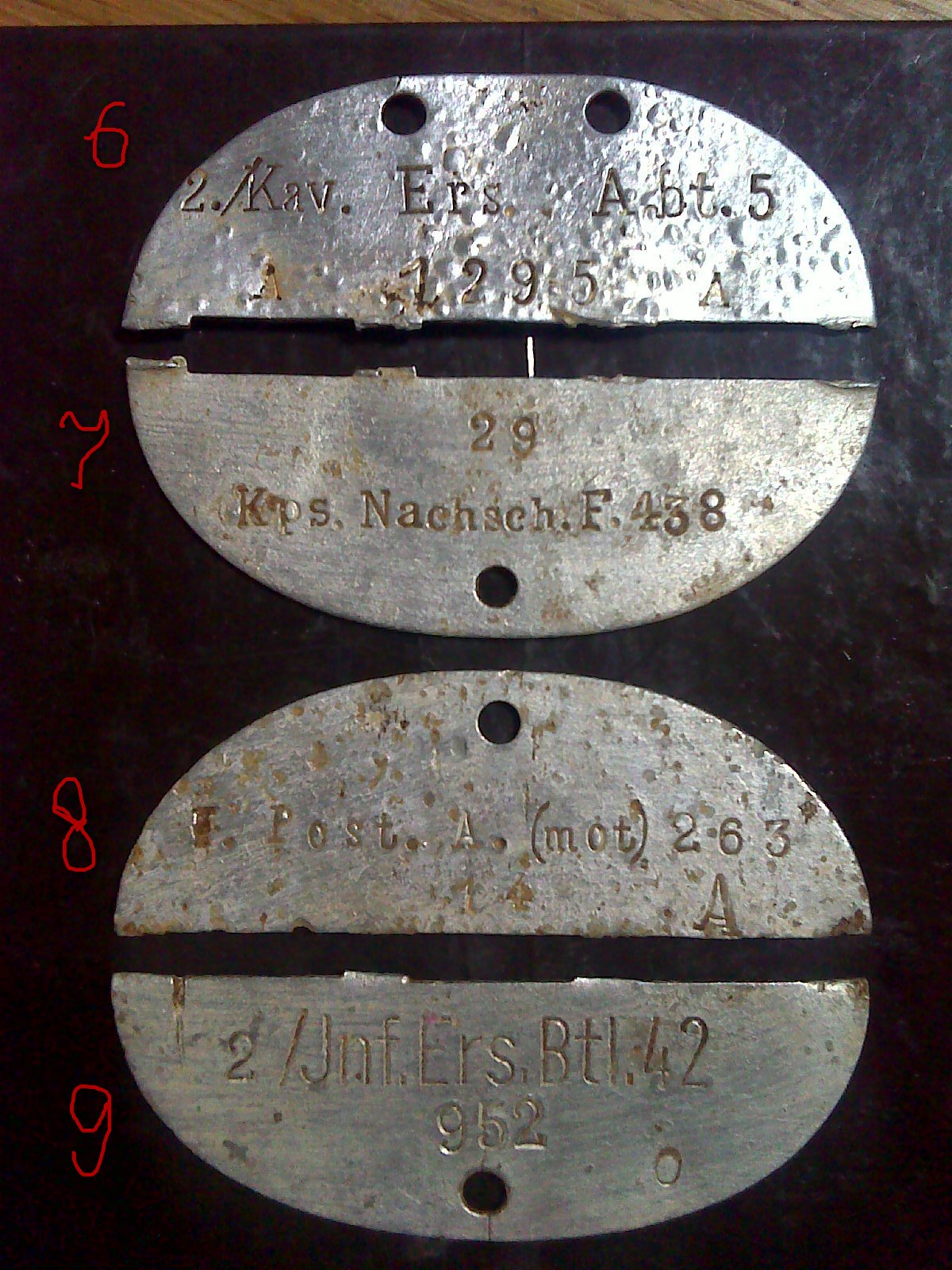 1. 1-я батарея 56-го тяжёлого дивизиона пополнения артиллерии, 2. 1-я рота 209-го батальона пополнения саперов, 3. 11-я батарея 207-го арт.полка, 5. 3-я рота дивизиона пополнения водителей, 6. 2-й эскадрон 5-го дивизиона пополнения кавалерии. Вроде так, остальные с телефона плохо вижу.