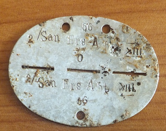 "Кадровая рота 59-го запасного тренировочного (или учебного?) батальона ПВО (моторизованного). № 142 в списке выдачи знаков. группа крови - вторая." Найден в лесу рядом со Ставрополем. На обороте что-то нацарапано, может быть фамилия, в немецком я не силен. Если кому интересен - пишите. |