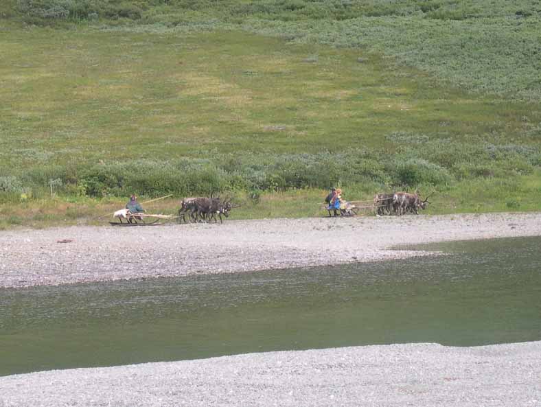 Ну а пока разгружаемся, жарим мясо, пьём огненную воду за прибытие и накачиваем лодки, чтобы подняться вверх по озеру. По другой стороне речушки следует пара оленных упряжек. - Да, олени и зимой и летом тягают сани - и по снегу и по камням и мхам. А Вы думали как-то иначе? Вложенные эскизы изображений |