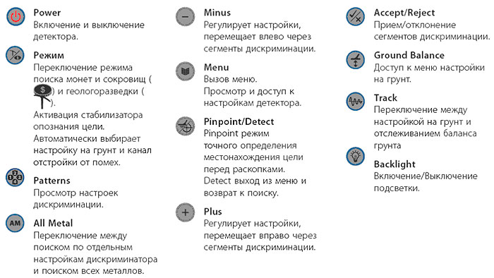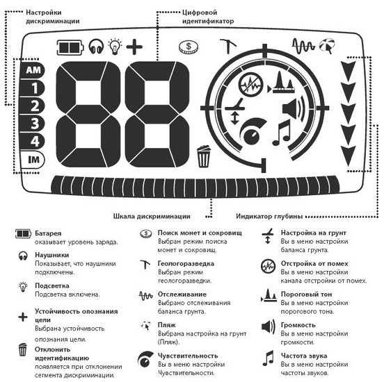 Как собирать прибор не упоминается. Указано в инструкции. Приступаем к настройке по панели управления. 1.Включение детектора. 2.Включаем кнопочку AM (все металлы), как советуют профессионалы. 3.Активируем устойчивость опознания цели. a.В режиме поиска нажимаем и удерживаем кнопку Mode три секунды. На табло появится значок , который указывает, что активирована устойчивость опознания цели. 4.Включаем режим поиска монет и сокровищ. (Не трогаем, пока, режим геологоразведки) 5.Выполняем отстройку от электропомех в автоматическом режиме. a. Нажимаем кнопочку Menu/Select b. Выбираем отстройку от помех. с. Нажимаем кнопку Mode , чтобы активизировать автоматическую отстройку от помех. Появится надпись AU, а сегменты шкалы меню станут индикатором выполнения настройки. В процессе настройки держим детектор неподвижно на уровне пояса. Через 15 сек. детектор автоматически выберет канал отстройки от помех. d. Нажимаем кнопочку Pinpoint/Detect , чтобы выйти из настройки. 5.Настройка баланса грунта (автоматический режим). a. В режиме поиска всех металлов (который мы уже поставили) находим участок, где нет целей. b. Держим катушку параллельно над землёй на расстоянии 10 см. Нажимаем кнопку Ground Balance . Держим катушку неподвижно и слышим непрерывное гудение. c. Нажимаем кнопку Mode , чтобы активизировать автоматическую настройку на грунт, непрерывно поднимаем и опускаем катушку (5-15 см.) (не касаясь земли). Появится надпись AU, а сегменты шкалы меню станут индикатором выполнения настройки. В процессе настройки держите детектор неподвижно. Детектор автоматически выберет настройку на грунт в течение 2-10 сек. в зависимости от почвы. Настройка закончена, приступаем к поиску. Приветствуются все дополнения. Хотел картинки пиктограмм и кнопочек меню разместить - не получилось. Вложенные эскизы изображений |