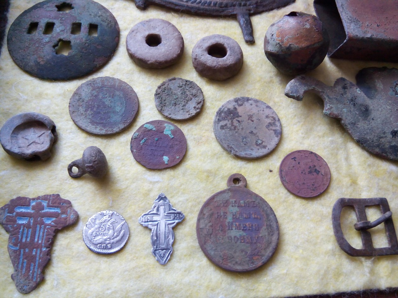 Поехал спонтанно-даже не планировал... Вообщем в 3:30 на месте, трава по колено, роса обильная, как после дождя, аж ноги промокли. Ходить тяжело: катуха в 20 см от грунта из-за травы, но сигнальчики проскакивали. Жаль уставшую медаль Русско-турецкой войны. И на облачнике не могу год определить... как-то так. Вложенные эскизы изображений |