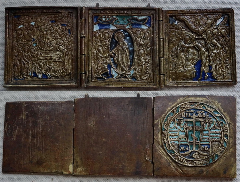 QUOTE(Г.Е.С. @ Sep 27 2018, 13:18) Вчера отдал две вещи привести в чувство, одна уже готова: Вот так расклад!!!!! Сам не ожидал!!!! Цитирую: Хорошая и достаточно не частая находка! Поздравляю! Редкий и по сюжетам, и по их компановке. Он даже будет поинтересней вашей арочной иконки-змеевика. По сюжету: "Успение Богородицы / Воскресение Христово (Сошествие во ад) / Богоявление". По Меднолиту, R8. http://mednolit.ru/photo/prazdnichnye_ikon..._008/284-0-4358 Была бы ещё эмаль полностью целая, цены б ему не было бы. Стоил бы тысяч 20-30, не меньше. А то и по более. Ещё редкости придаёт "крапчатая" эмаль по центру центральной створки (синяя с белыми точками). Но даже и в таком виде, вещь довольно интересная! -------------------- Куплю большие Киотные кресты, спайки, большие меднолитые иконы, самовары необычных форм и размеров.