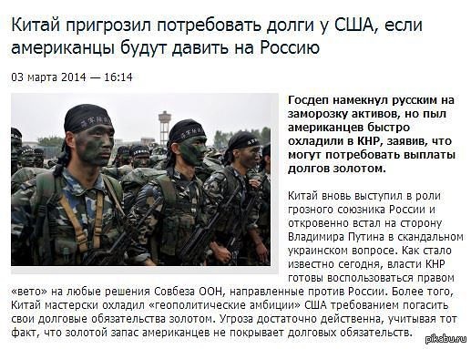 QUOTE(Г.Е.С. @ Mar 5 2014, 18:50) Какие же Китайцы жестокие Жень, это деза. Китай отказался поддержать российскую позицию в ООН, из-за этого Путин сбавил обороты. |