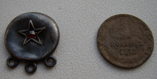 QUOTE(Зуф @ Aug 9 2014, 18:22) Бывает.А что это за предмет,слева? Звезда с "рубином",как кремлёвская. Сам в догадках. Часть какого то украшения может быть, с постреволюционным уклоном.Внутри полая. на обратке следы припоя от следующей детальки. |