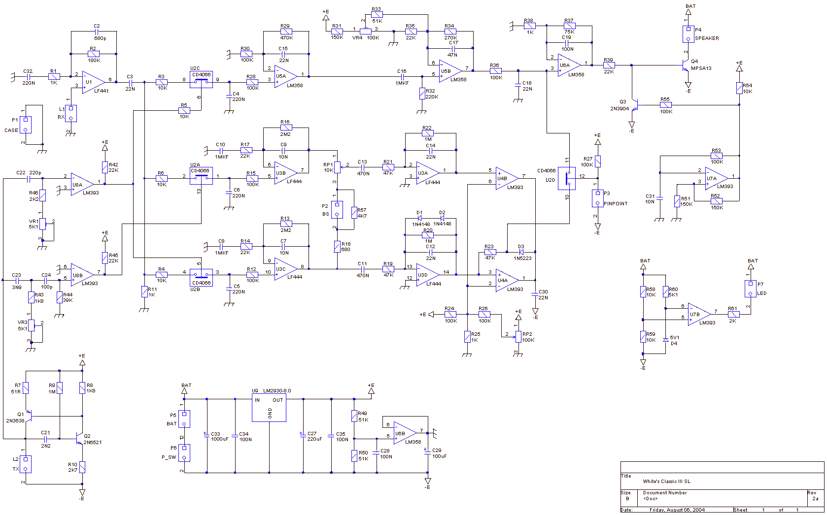 Катушка подключена к прибору и через переходник подключена к усилителю если поднести монету то сигнал увеличивается и помех поменьше. Может что то намудрил в схеме А где можно оригинал посмотреть? Эта схема с какого Вайтса? Помехи по ВЧ можно срезать если подключить паралелльно 100кОм емкость 680пФ как в на фирменной схеме, но в принципе достаточно порядка 200-400 пФ. Схема Вайтс Классик 1, 2, 3 они мало менялись. Вложенные эскизы изображений |