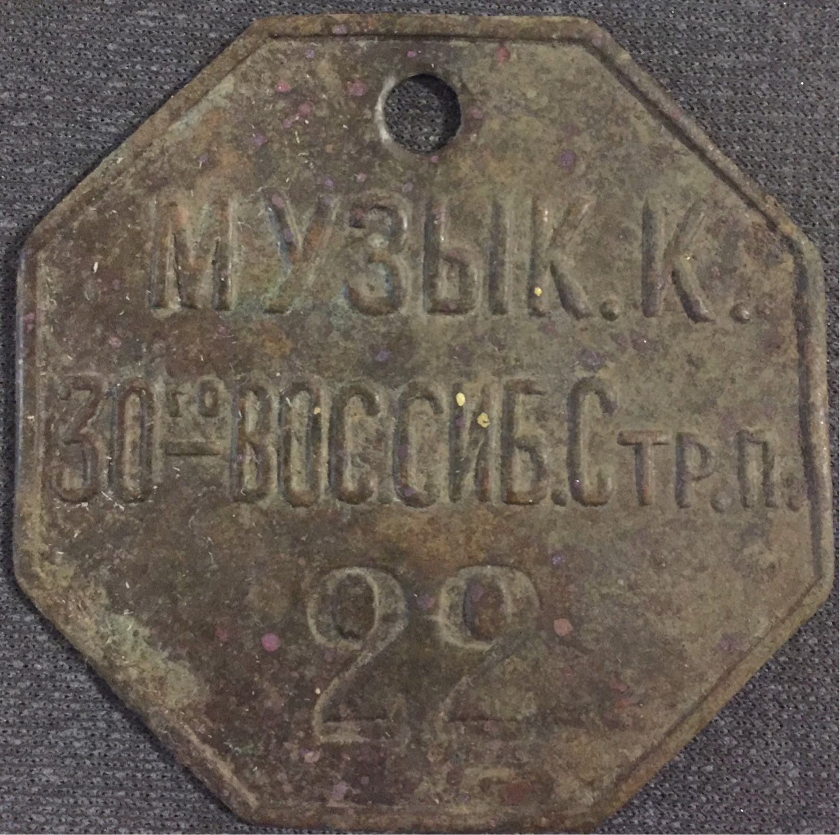 Увольнительный жетон нижнего чина №22 музыкальной команды 30-го Восточно-сибирского стрелкового полка. От 2 т.р. спасибо за информацию!! |