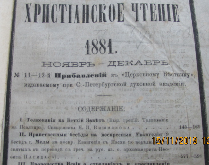 День добрый! Нужна помощь в определение и оценке журнала "Христiaнское чтенiе" 1881 ноябрь-декабрь.Как я понял журнал печатался один раз в 2 месяца и являлся продолжением предыдущего номера и поэтому начинается не с первого листа,а продолжается тот номер(возможно ошибаюсь),но вырванных листов и признаков такого нет.Поэтому нужен грамотное определение и насколько он ценен.Состояние среднее.Заранее благодарен.