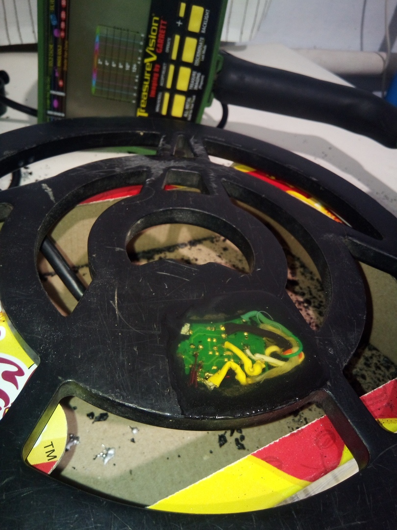Ремонтировал недавно катушку от Гаррета 2500. Укоротил провод в месте где он входит в катушку. Оказалось там почти все повреждения. Вскрыл с помощью паяльной станции. После проверки залил эпоксидкой. При проверке в доме работала стабильно. Экран в этом месте не так важен как в месте самих катушек.