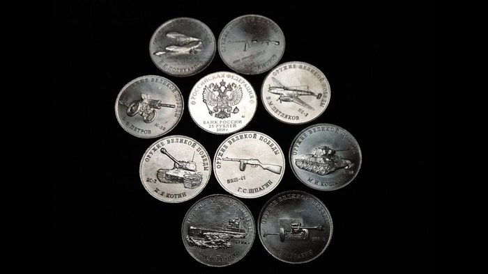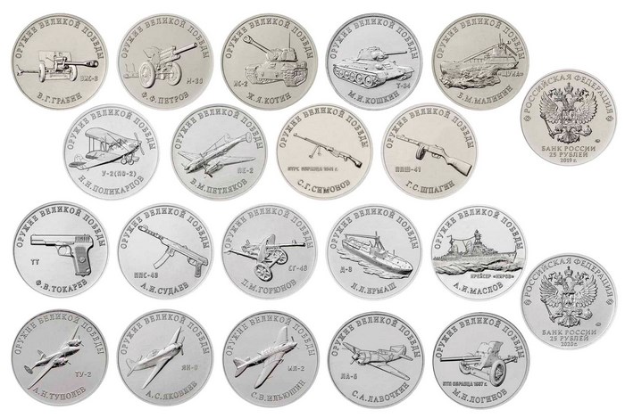 Продам полными наборами 25 рублей 2019г. Конструкторы Оружия Великой Победы из мешка ММД 19шт., стоимость 1набора 2000руб.+10руб. 75лет Победы БИМеталл (30руб.), есть блистерные альбомы на 20 монет+200руб., пересыл от 200руб. оплата на карту СБ, лоты в Санкт-Петербурге.