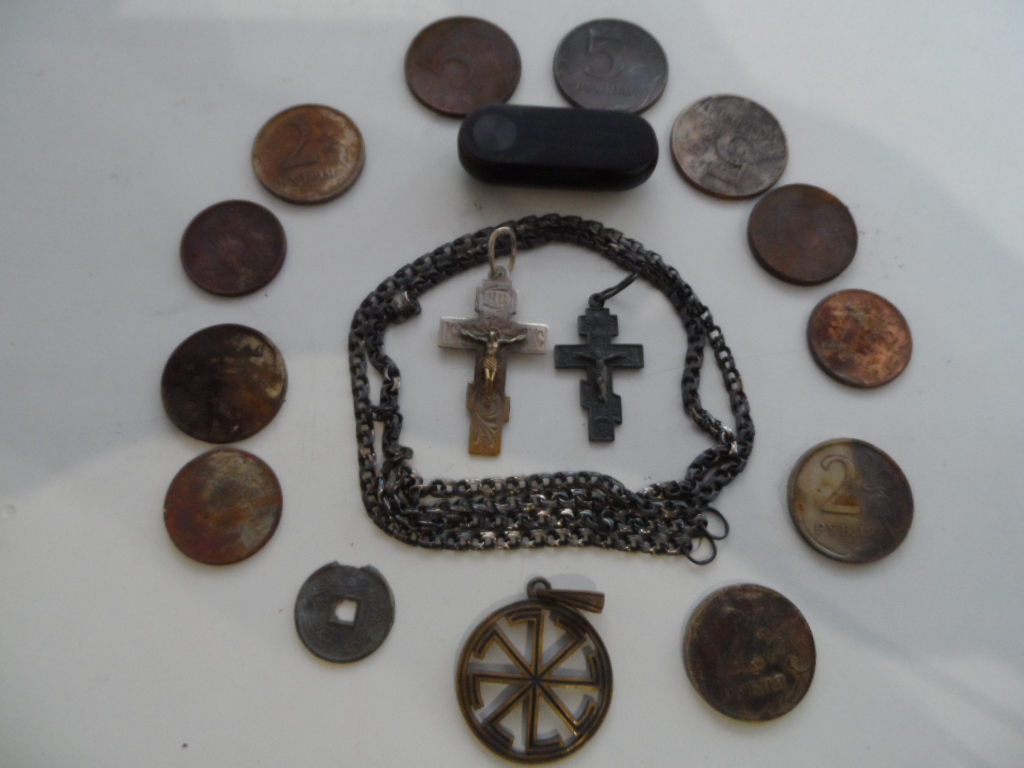 У меня чуть получше, свинцовый перстень "череп коровы", медный крестик и замочек от голдовой цепочки, фотать это рука не поднимается ))