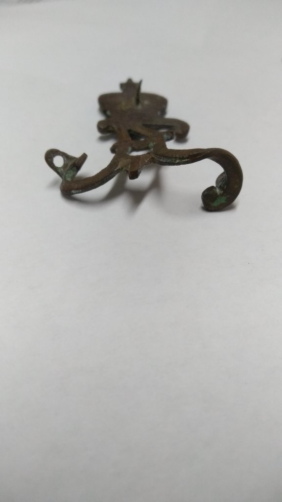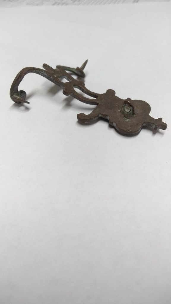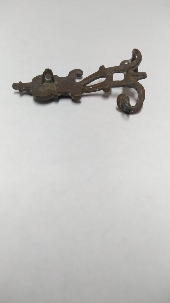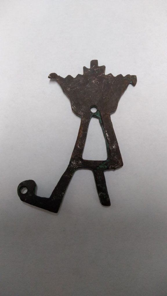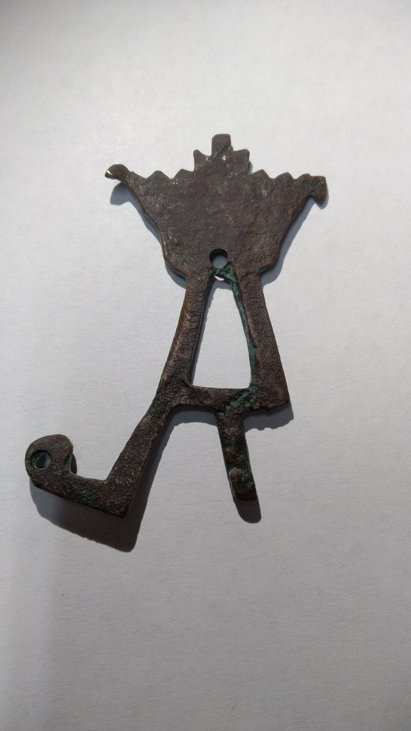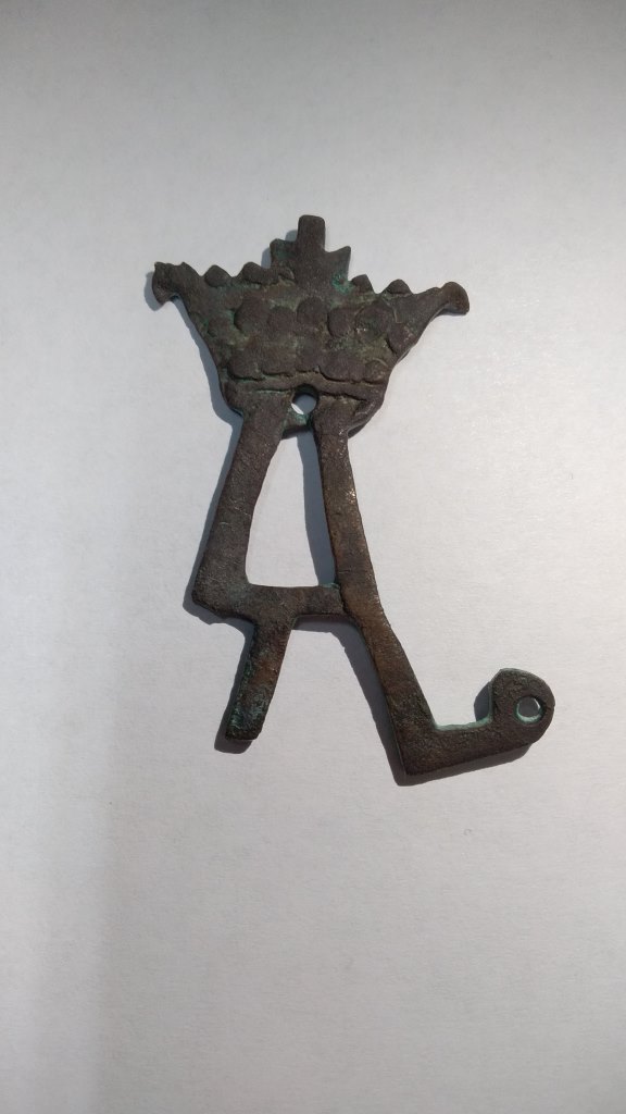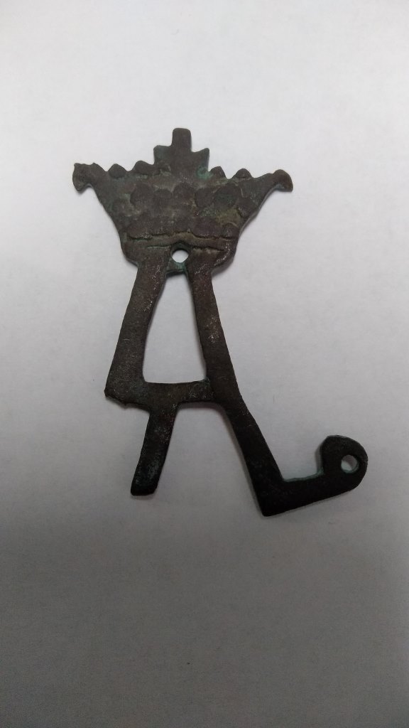 Здравствуйте. Благодарю за высказанные всеми участниками мнения. Размеры : целый 61 мм высота , 42мм ширина (приблизительно) толщина 2,5 мм. Обломан : 59 мм высота, ширина 49 мм (приблизительно) толщина 2,5 мм. Выкладываю фото обломанного, постарался сделать чётче место слома. Если это не вензель А- 1 то что ??? -)) С уважением ко всем участникам.