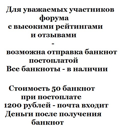 Для уважаемых участников форума с высокими рейтингами и имеющих хорошие отзывы - возможна постоплата. Если сомневаетесь, пожалуйста отправлю постоплатой. Деньги после того, как получите банкноты и сами все посмотрите лично) Все банкноты в наличии!