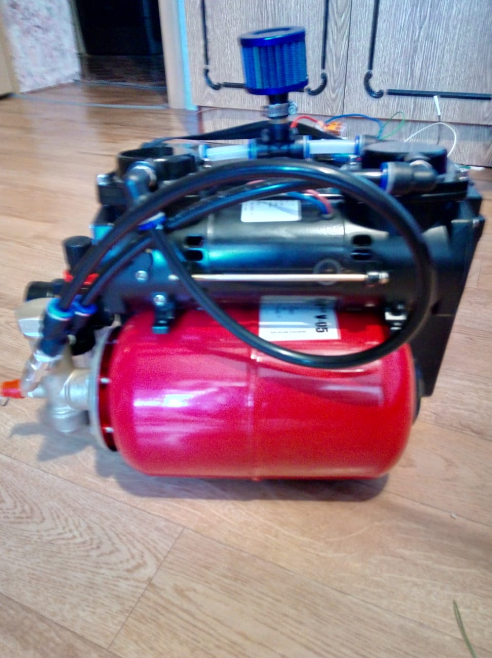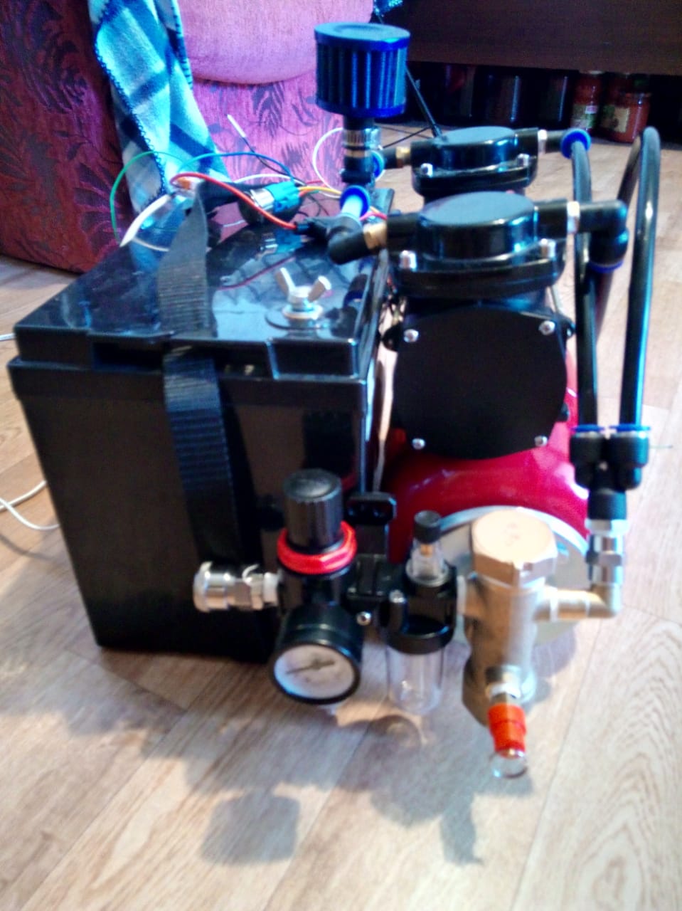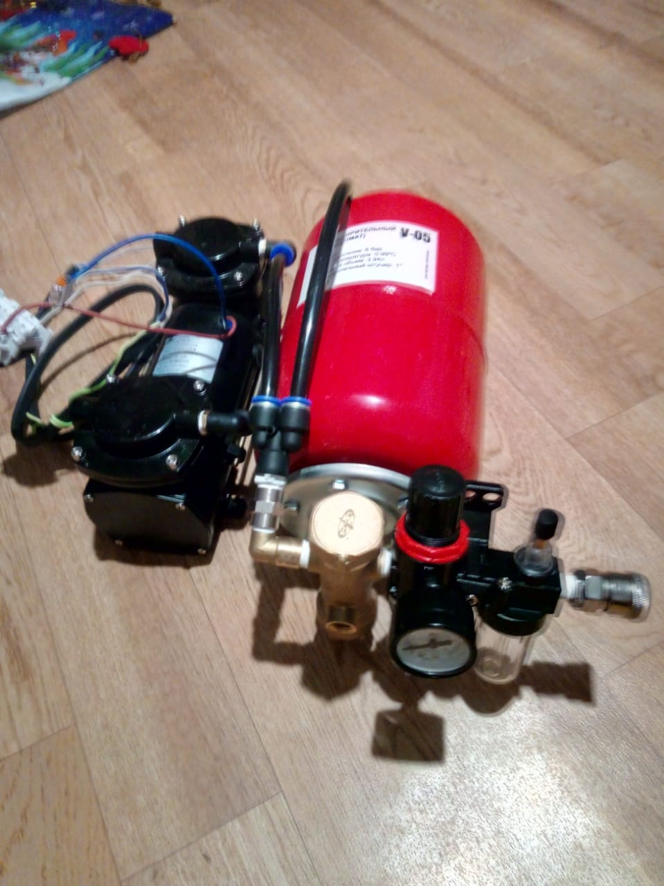 И ещё полиамидные трубки через которые соединяются фитинги тоже диктуют условия вертикального размещения компрессора с ресивером.