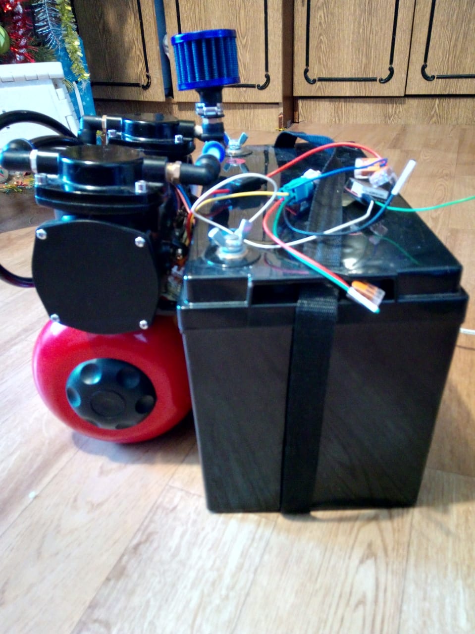 Дело в том что внутренние размеры плота составляют 500мм на 500мм. В эти габариты мне нужно уместить аккумулятор и компрессор с ресивером, поэтому требуется бак и компрессор объединять в вертикальном положении.