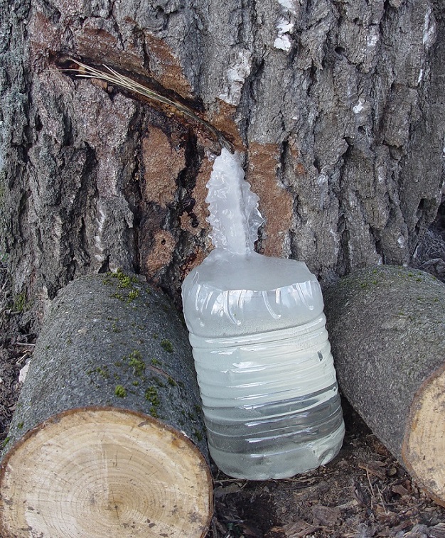 Привязываю шпагат к дереву выше точки забора сока. Сверлю в березе отверстие с южной стороны. Одеваю крючок на шпагат, вешаю на него канистру. Вставляю отрезок силиконовой трубки одним концом в крышку канистры, другим в отверстие в стволе. Оставляю на 10 часов. Снимаю канистру с соком, отверстие залепляю садовым варом. Моя норма забора сока - 5 литров с одного дерева в год. Год дерево отдыхает. Самогон из березового сока очень мало отличается от простого сахарного. Пробовал. -------------------- Смеркалось...