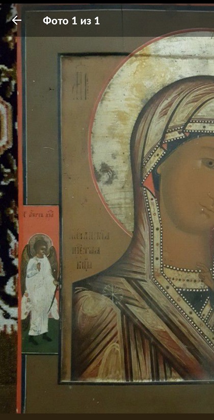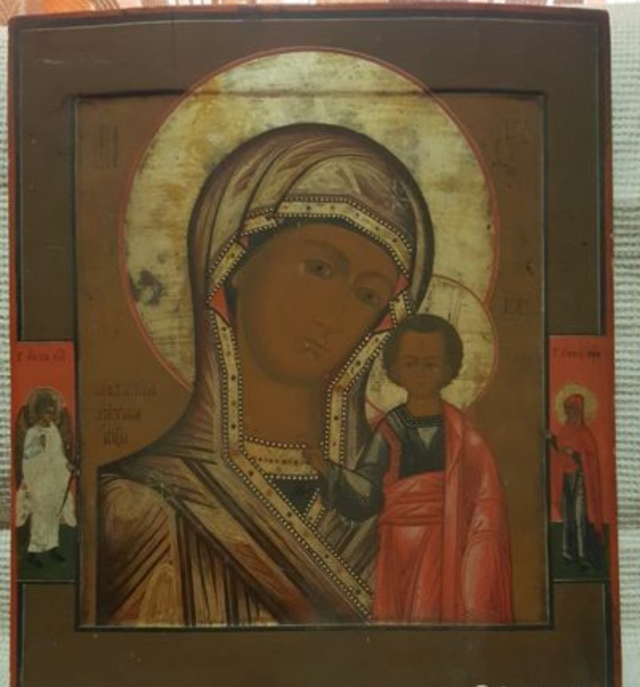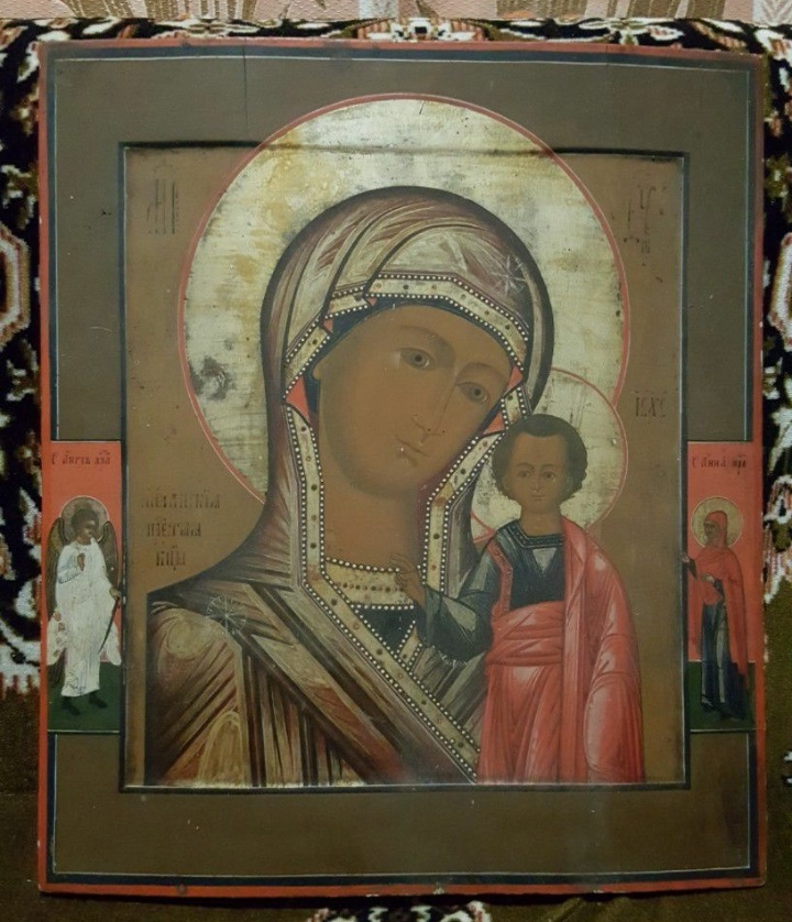 Образ Казанской Богоматери с предстоящии ангелом хранителей и Анной Пророчицец, середина 19го века, центральная Россия. По цене сейчас все очень сложно, не дешевле 12000 руб. точно.