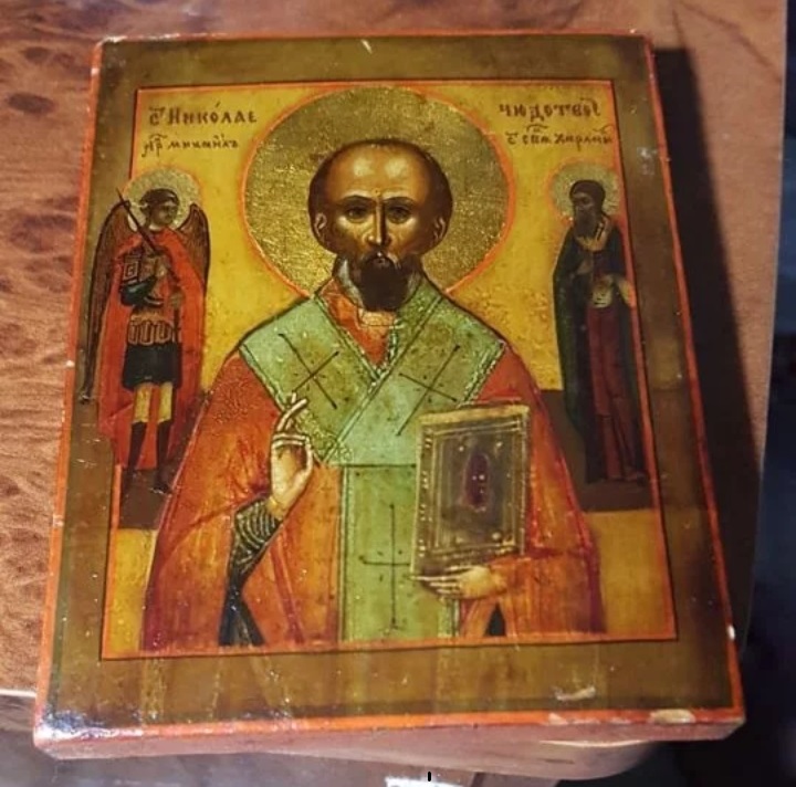 Подобные Иконы всегда покрывались слоем Олифы, который бабушка удалить не смогла бы. Не виден кракелюр или хоть какието следы бытования. Учитывая что доска выгнута, должны быть последствия на живописи.