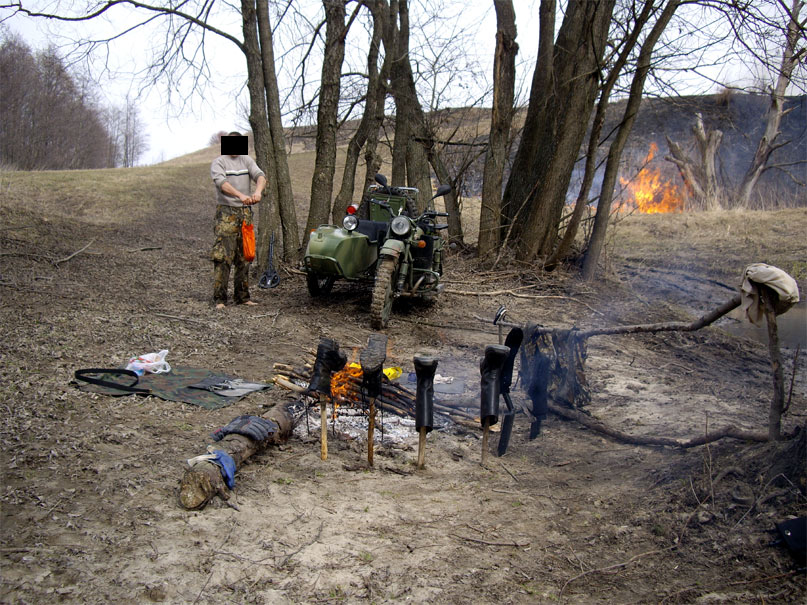 Вообщем скакали вокруг него минут 20. Потом оказалось, что он с разгону налетел валом коляски на кусок железнодорожной шпалы, которую кто-то с радостью кинул в реку. Еще минут 10 ушло на откапывание этой сваи и извлечения ее из под мотоцикла. После чего мотоцикл радостно уехал на берег. Фото самого вытаскивания не сохранилось, зато осталось фото просушки одежды после форсирования. Вложенные эскизы изображений -------------------- -