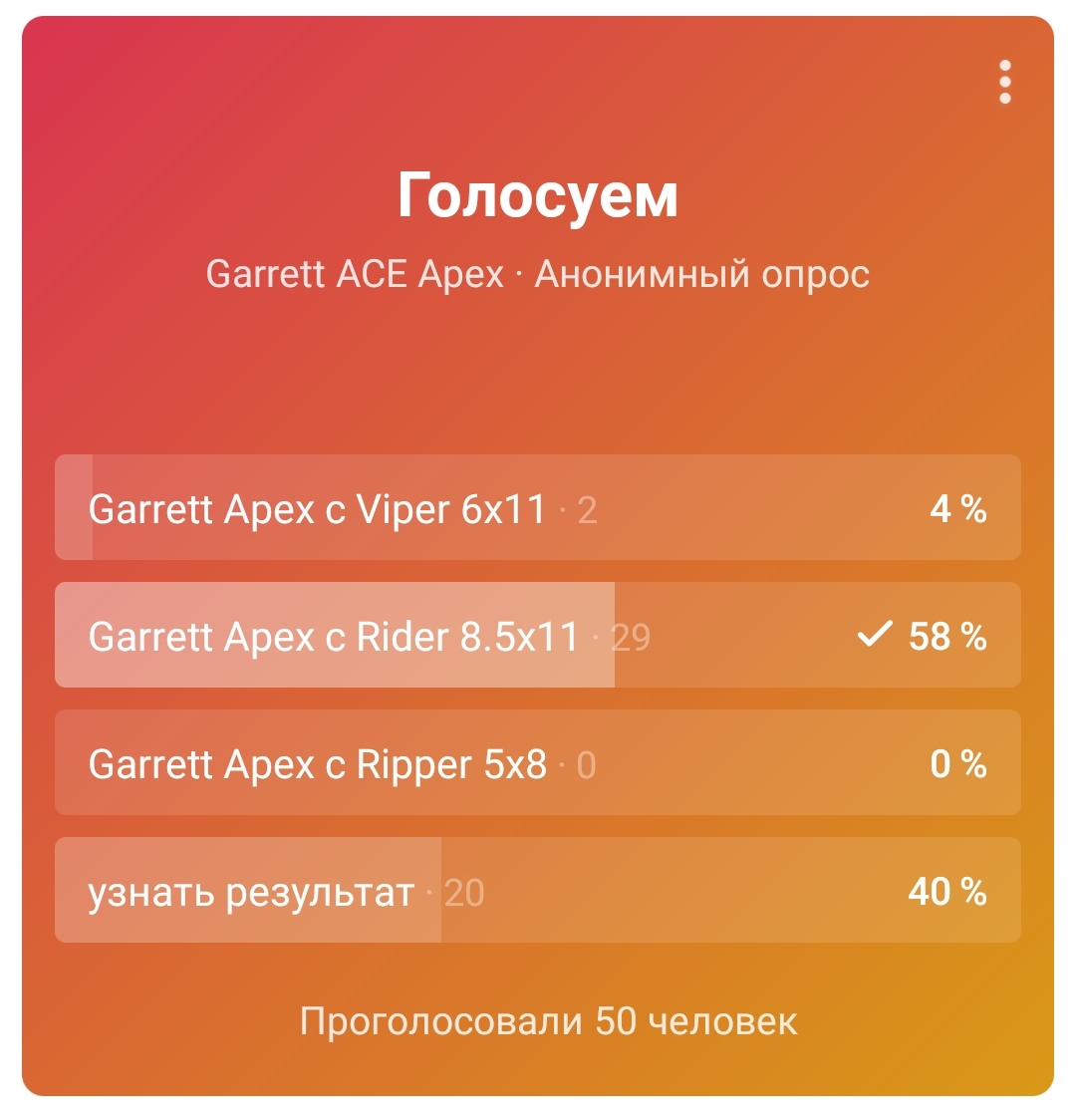 QUOTE(Потрошитель @ Dec 25 2020, 22:53) Глупость очередная, тесты катушек сторонних производителей говорят как раз об обратном. С хорошей катушкой (9" или 11х12" ) ураганит и посуху и ни как не шумнее прочих именитых. А то же вы его со снайперкой тащите в поле , вместо пляжа или шурфа, и : ой б... ть он цели видит только неглубокие до 30см, как же это. Да вот так, прибор нужно укомплектовать для работы в конкретном месте, а потом уже слюни в инете размазывать. А то что продаётся в базовой комплектации, умному человеку понятно, затачивался прибор в первую очередь для работы на морских пляжах. За что и большое спасибо фирме Garrett.))) Не ну ты посмотри на него... Прямо вторая молодость Хватит уже выдавать желаемое за действительное Про глубину с катушкой вайпер я всем говорил что ждать чего то дельного от неё не стоит... Это ты меня с кем то спутал опять... Я говорил что глупо снайперку давать которая нужна только 0.01 % И кстати в группе опрос устраивал с какой бы катушкой вы хотели апекс, сказать результат?! 🤣🤣🤣 см картинку По-моему более чем показательно... И практически одновременно с этим опросом когда итог стал очевиден, пришло сообщение что скоро продавцы начнут давать катушки на выбор! Согласен что укомплектовывать прибор нужно, но если вы хотите максимальных продаж своему прибору то наверное надо давать катушку которую хотят люди а не навязывать им снайперку Про фантомы я уже не знаю как тебе объяснить Сообщение отредактировано Белый Копатель: Dec 26 2020, 02:35 Вложенные эскизы изображений |