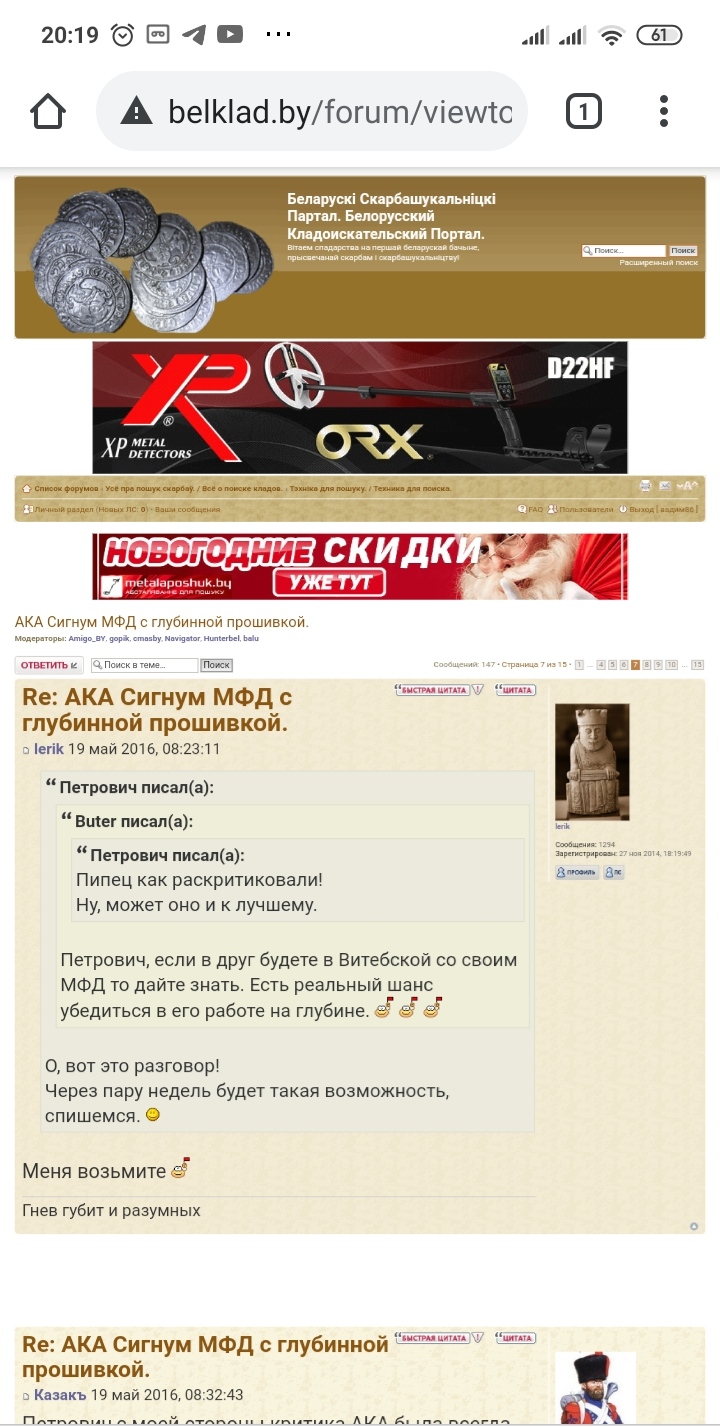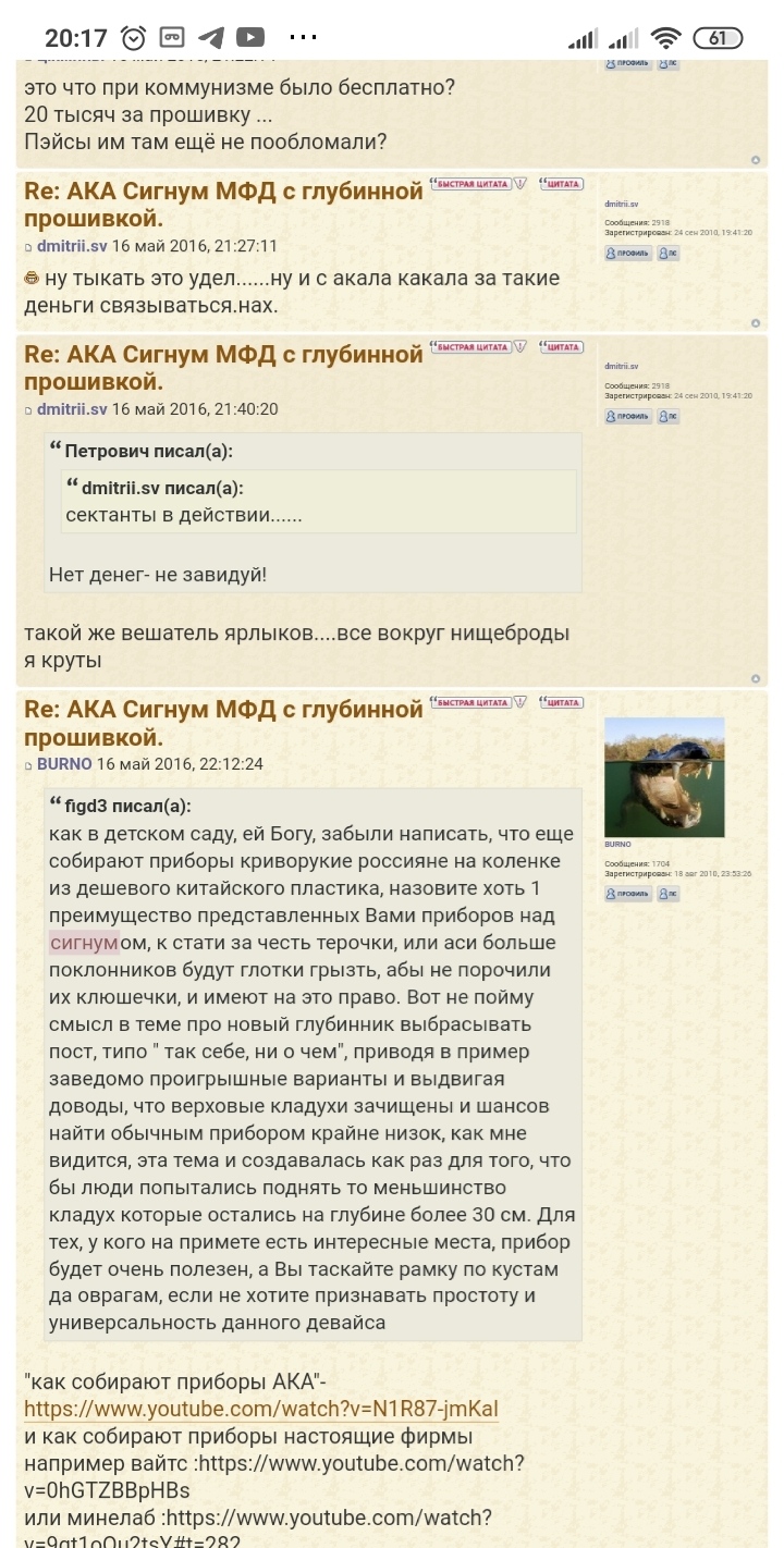 QUOTE(п.Петренко @ Feb 4 2021, 07:47) А не приходило на ум самое простое и верное объяснение наличия у некоторых несоответствий тестовых результатов и результатов в поиске - не способностью оператора услышать эти экстремально глубокие сигналы? На яме, где внимание сосредоточено и координаты цели известны он их слышит , а в свободном поиске тупо проходит мимо. Тут и в распи##яйстве может быть дело, в отсутствии слуха, в плохих наушниках и венцом конечно " Я и без наушников все прекрасно слышу'(с) И не только для ака приборов в этом проблема. Множество раз уже было, что при перепроверке глубокой цели приборы прозревали если им точно ткнуть где разнюхивать, проблема только в том, что с прохода они эти цели не берут. Ну и мои разгромные победы случаются только там где материал есть в наличии. Уже месяц #опа какая то ..."А не приходило на ум самое простое и верное объяснение наличия у некоторых несоответствий тестовых результатов и результатов в поиске - не способностью оператора услышать эти экстремально глубокие сигналы"... Так ёпрст (не мат! -------------------- ..."и скажут: ты безумец, потому что не безумствуешь вместе с нами".