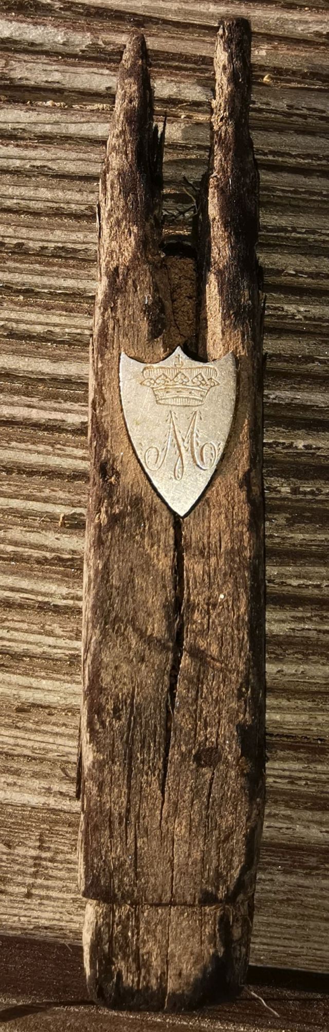 Извините, что выложил в данный раздел, но мне кажется большая часть людей кто может определить вензель с короной находятся здесь. Товарищ показал остатки какого-то изделия, на нем закреплен серебряный знак, в виде вензеля буквы М и короны, прошу сообщить есть возможность определить? Вложенные эскизы изображений -------------------- Sevas