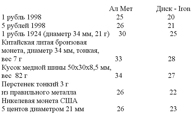 Монеты / Режимы АМ+ТихийТреш Д=Айрон Д=Айр(+макс.Треш) 1руб.Россия 1998г 29-30см. 19см. 23см. 5руб.Россия 1998г 29-30см. 19см. 20-20,5см. Всё предсказуемо и почти , как у Вас ...в АлМет я может просто лучше Вас отстроил ГулТреш . Для крупной меди(монет) и алюма глубина хуже , чем для монет из более низкопроводимых сплавов ...для крупной меди люди докупают ДД катушки от Детеч 12х10. Всё , как и должно быть на высокочастотных МД . ЗЫ: ВаДяН ...накликал |