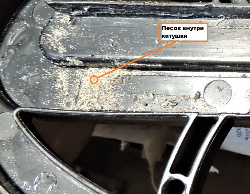 Лишняя проводимость была, но со временем она уменьшалась и уменьшалась. Но глюки в катушке оставались. Потому решил ее разобрать. Не без труда, но обмотки вышли из корпуса. Из-за отслоений эпоксидки от корпуса, внутри катушки была влага и песок. Влага высохла, но песок остался. Что видно на фото.