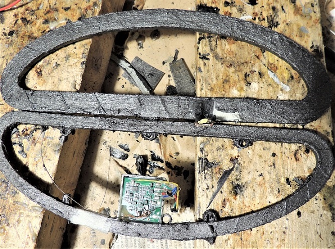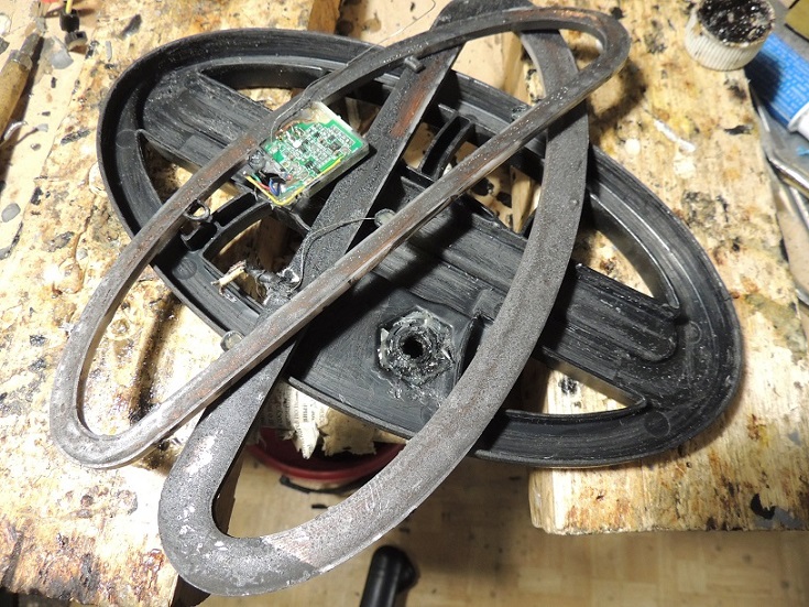 Разобрал катушку. Остался корпус, с красивой защитой. Думал сделать другую в этом корпусе. Но обмотки, уложенные в пластиковые канавки удалось вытащить без повреждений. Из-за попадания воды, экран с этих обомток местами слез вовсе, и потому были глюки. Осталось нанести экран на обмотки и собрать катушку снова. Запах нитролака и ацетона, это плохо. Но хорошая катушка, это хорошо. Покрыл экраном, обмотал проводом. Обмотки готовы к сборке катушки.