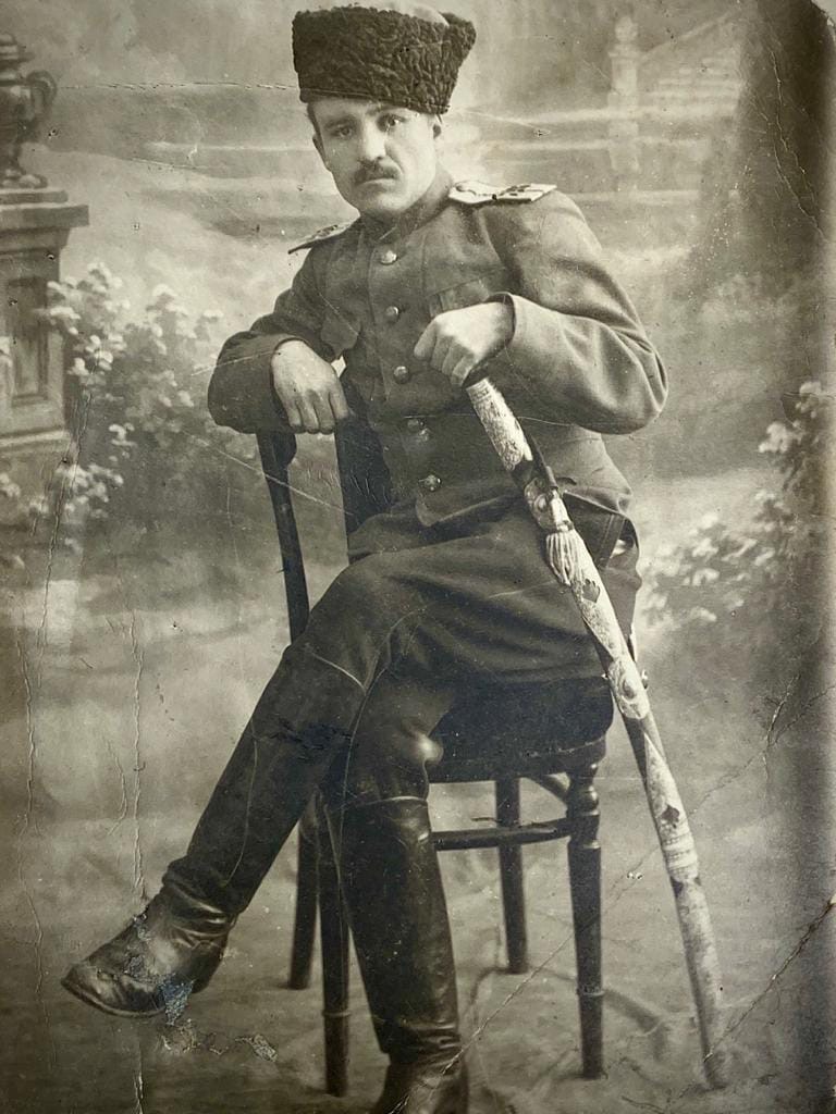 На погонах шифровка буквами а какими не разглядеть Шашку держит легко как будто это часть руки на ней виден темляк Скорее всего шашка его Крутая!!