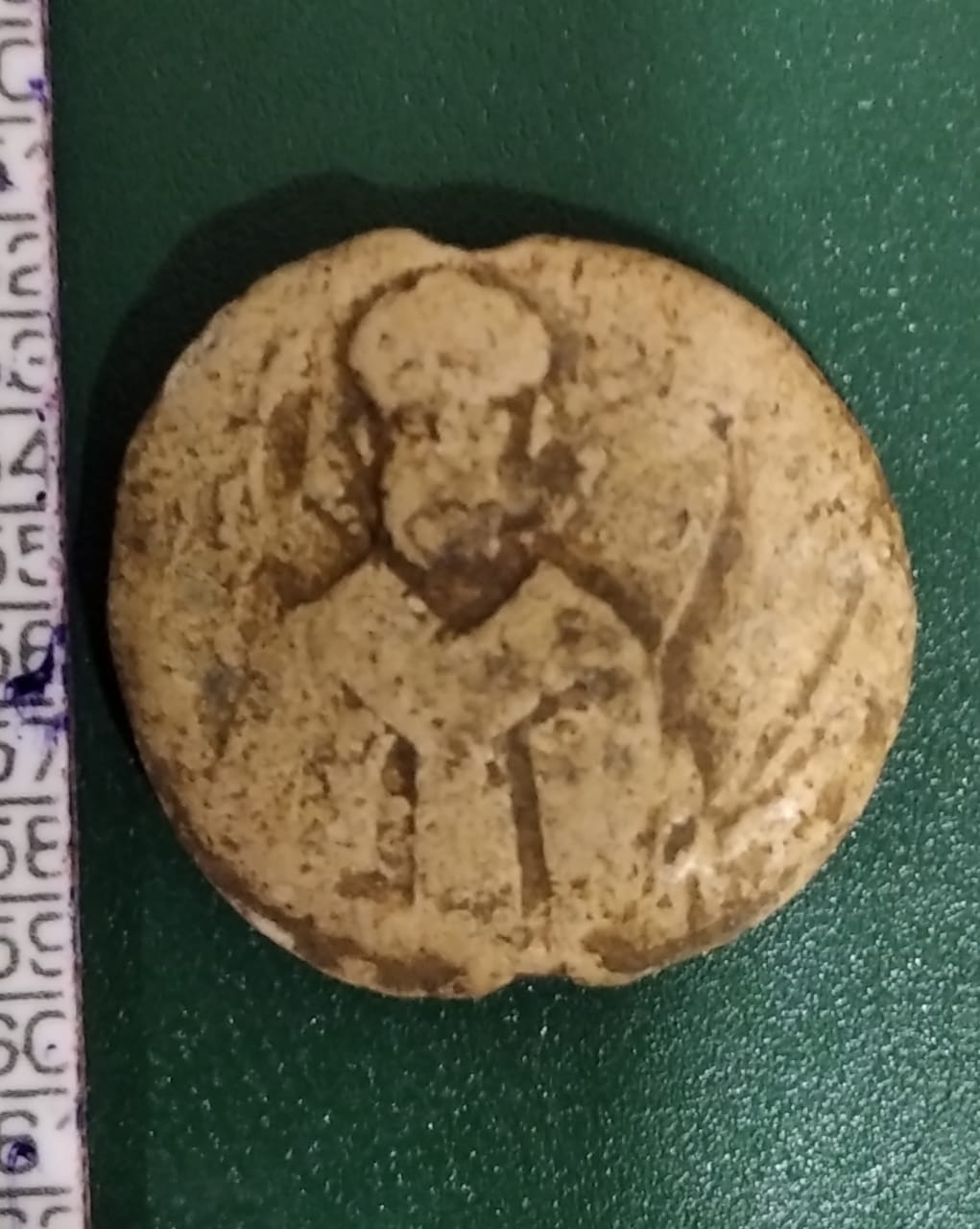 №279. Тип 3. Л.с. Поясное изображение св. Георгия с копьём в правой руке и со щитом в левой. Слева: знак "агиос" -ГН-ОС, справа: Г-ЕО(Р)-NО. Вокруг точечный ободок. О.с. Поясное изображение св. Николая Мирликийского. Слева колончатая надпись: знак "агиос" -NН-КУ, справа: Л-А. Вокруг точечный ободок. Диаметр 23 мм. Место находки: Ленинградская обл., Волосовский р-н, 2012 г. Хранится в ч.к. (Жуков И.А., 2013. С. 17-18. Тип 2, рис. 5). -------------------- Куплю вислые печати К.Р.