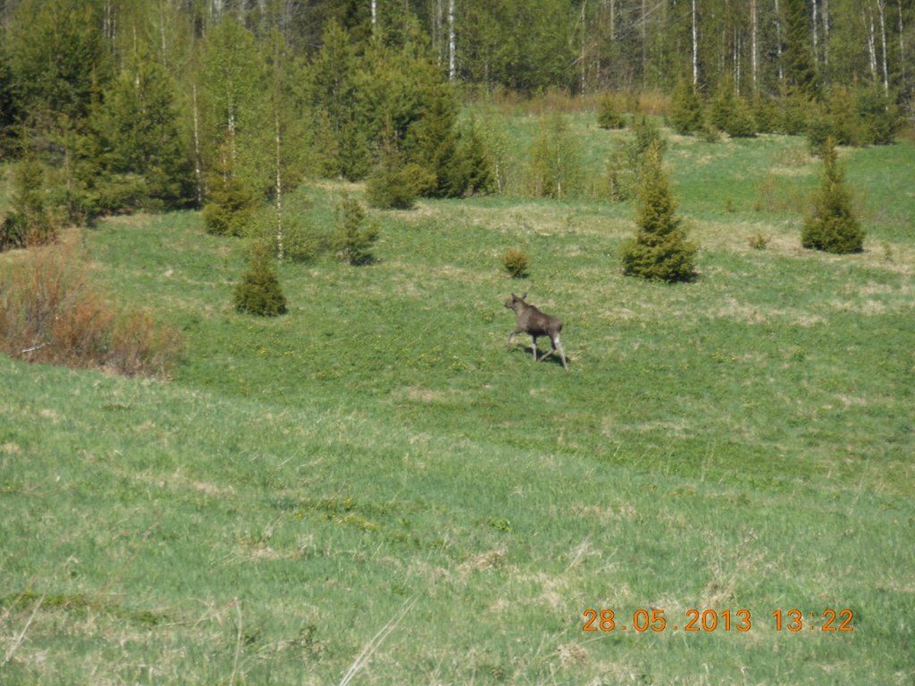 Был я на сплаве!300км на лодке!с другом плывем по течению!решили по рюмке бахнуть.выпили.болтаем.вдруг друг говорит-смотри,корова кажется.я по навигатору посмотрел,нет деревень рядом.говорю-давай к берегу ближе!подплываем-Лось.я другу говорю-сиди в лодке,а я пошёл,знакомиться!!беру прибор,лопату и по склону горы вперед.Иду машу!вдруг сигнал!копаю-пуговица англичанка.поднимаю голову лось с дерева листья жует!я к нему.он увидел.и к лесу.ну .думаю не успел познакомиться и сфоткать.решил в направление лося проверю поле.опять сигнал.копаю деньга17...поднимаю голову,а лось обратно пришел.я ему -Привет!он разварачивается и не быстро пошуршал к лесу.я сфоткал что успел и за ним!прошел я редкие деревья и опа...деревенька !!!остатки последнего дома!покопали и советов и империи!вот так Лось вывел на деревеньку!а жаль ушел!фотка в обнимку с лосем!была бы прикольная!