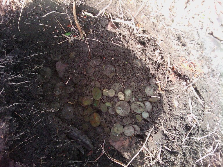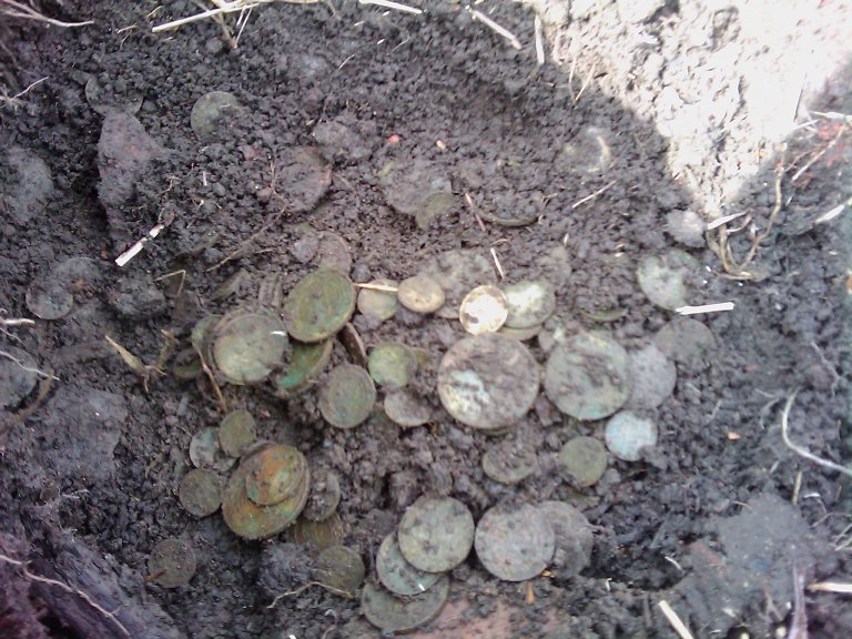 Здравствуйте коллеги ,много читаю рассказы о нашедших клады и только радуюсь за них. И вот пришла возможность рассказать свою историю .Дело было прошлой весной (раньше не было возможности ,да и времени , перекинуть фото с телефона ) .Как стаял снег ,начали ездить на коп за тридевять земель, думая чем дальше, тем больше накопаем . Но увы, бывало что и с пустом приезжали ,Трава все больше подрастает а в коробке не копится , вот я и решил пробежаться по старым местам . С прошлого года вспомнил одну деревеньку где попались мне две слипшиеся монетки Николая второго и решил там повыбивать все сигналы .Пришел на место , начал выкапывать все железо в подряд, не прошло и десяти минут и бац б..... они и посыпались , радости была полная ..опа . Не смотря на сырую землю ,встал на колени и начал выгр###### монетки , я выгребаю а они все высыпаются и высыпаются . Мозг отключился, включился когда все выгреб и сигналы закончились . В кладе насчитал 2200штук , от копейки до пяти . После этого отпало желание уезжать черт знает куда на покопушки , хожу по местным деревушкам . Вот такая вот история . Да про монеты. Через 2 недели приехал дядька с толстым кошельком и все забрал. За рассказ особо не пинайте , я не писатель . С Уважением ко всем.