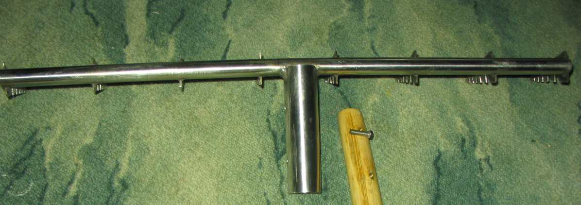 Забрал это нержавеющее чудище у мастера. Делалось как видите почти по рекомендациям Никонлайна. В основании - трубка внешним диаметром 20мм, толщина зубьев 3мм, ширина тяпки 56см, расстояние между зубами по 8см. Как я и хотел грабли вышли не тяжелые и достаточно прочные. Одна сторона трубки заглушена, вторая нет, эт для того чтобы можно было при желании регулировать вес граблей. Нужно утяжелить - засыпай свинцовую дробь и затыкай резиновой пробочкой. Для того чтоб не шокировать пляжный народ предусмотрено монтирование граблей на древко прямо в воде, в древке сделаны отверстия и вставлены латунные дюпеля под винты М5, занес по-тихому палку и в пакете грабли, в воде быстренько наживил два нержавеющих болтика и вперед работать. Жаль на практике еще не успел испытать.