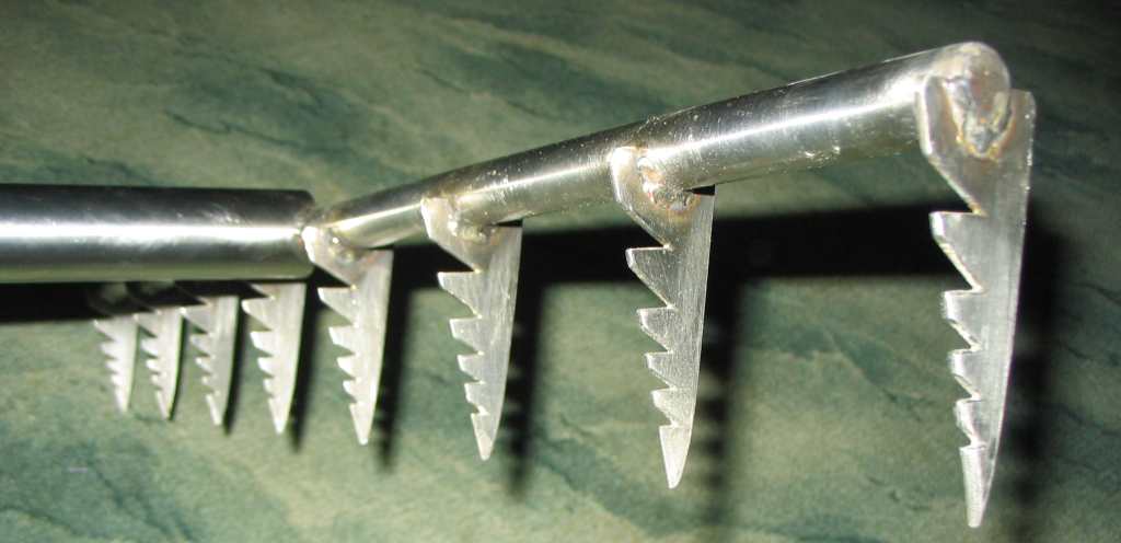 Заказал себе грабли из нержи. В основе - трубка диаметром 20мм, длиной 56см, приваренных к ней клиновидных зубьев - 8 ( через каждые 8см), в каждом зубе по 5 пропилов и вертикально приварен кусочек трубы потолще для древка. Коля, вопрос, зубья делать из нержавейки какой толщины? Как считаешь? Я хочу не слишком тяжелые грабли, потому зубья из 2мм стали, мастер же упирается, говорит что за счет пропилов будет утеряна прочность, поэтому сталь не менее 3мм..... рассудите.