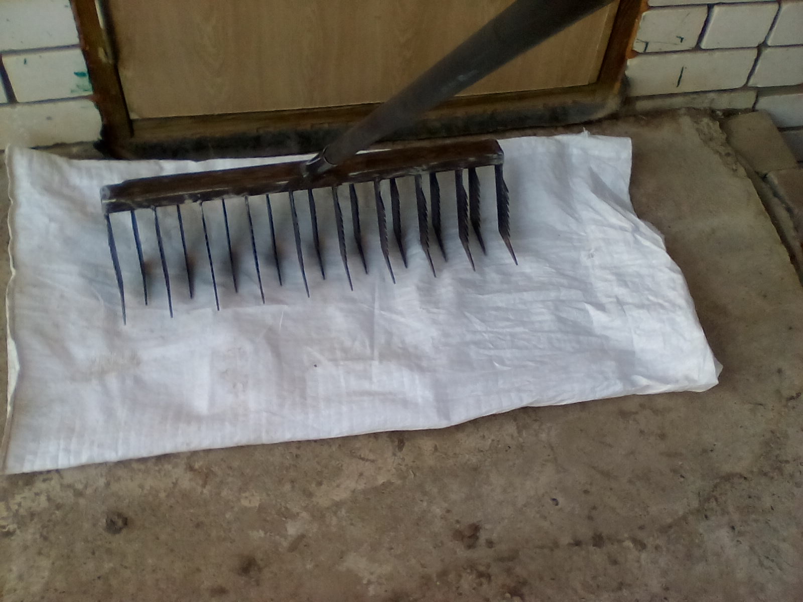 На жёстком песке второй ряд (дальний) работать не будет, лучше все ножи в один ряд приварить более универсально получится под разные грунты, всё равно только первые 2-3 зуба на ноже работают а глубже и не надо, и самое главное осталось сделать регулировку угла наклона черенка на граблях, тогда можно будет работать и с грунта и с мостика и зимой по проруби со льда.