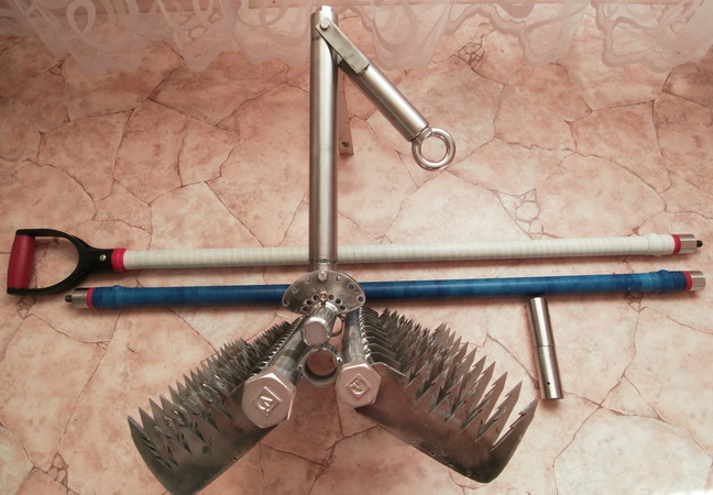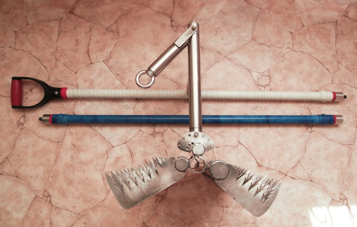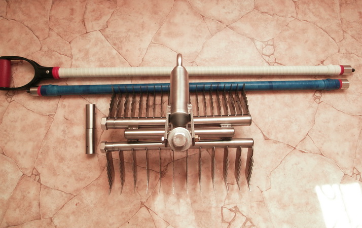 По просьбе в личку выкладываю дополнительные фото комплекта, там, где поворотная штанга с рымболтом, откручивается заглушка и прикручивается разборный черенок из толстостенных алюминиевых труб. Собранный трал с черенком получается 2м. 36см.,чего хватает тралить как в воде, так и по песку пляжа. Есть ещё и дополнительный переходник-свёртыш \есть на фото\, т.е. можно добавить промежуточный черенок \трубу\, увеличивая общую длину до бесконечности