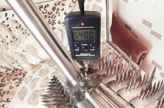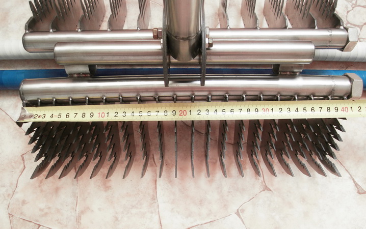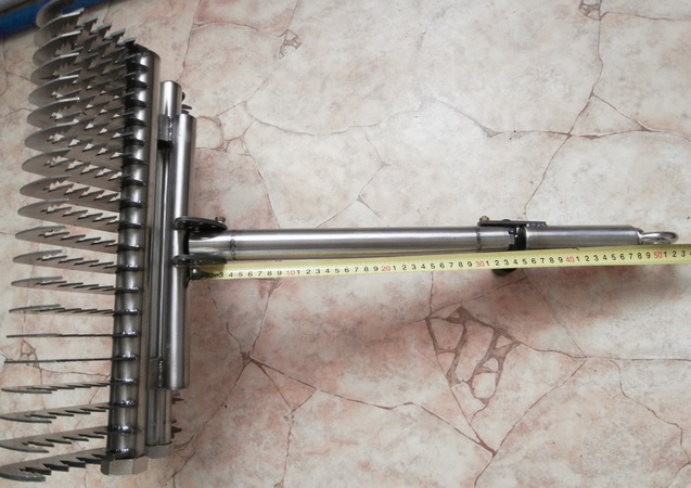Размеры и ножи: - 13 см., с разбегом 3,5 см. 15 ножей. 2 ряд: Ножи 9 см., с разбегом 2 см. 20 ножей. Все 4 крайних ножа, на обоих сторонах усилено 2мм.х 2мм.= 4мм., что-бы не гнуло при боковом ударе о дно.