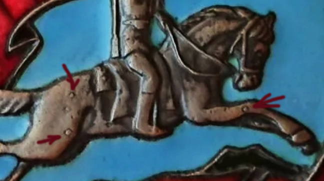 Оригинальный знак - ШТАМПОВАЛСЯ. А представленный на обсуждение артефакт - ЛИТЬЁ. Причём, литьё некачественное. Чего стоят "пупыры" на лошади (прикипевшие шарики), которые могли возникнуть только в результате некачественного литья: