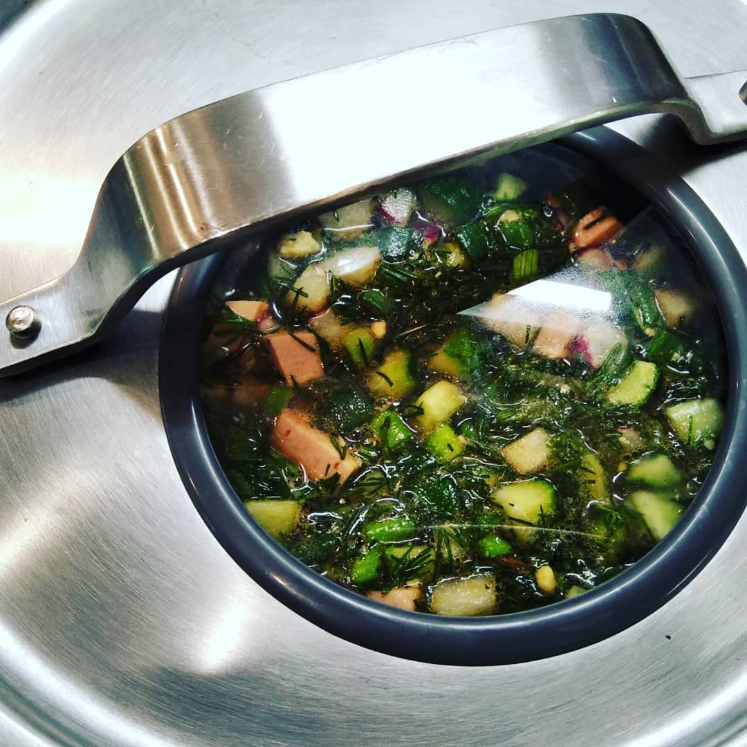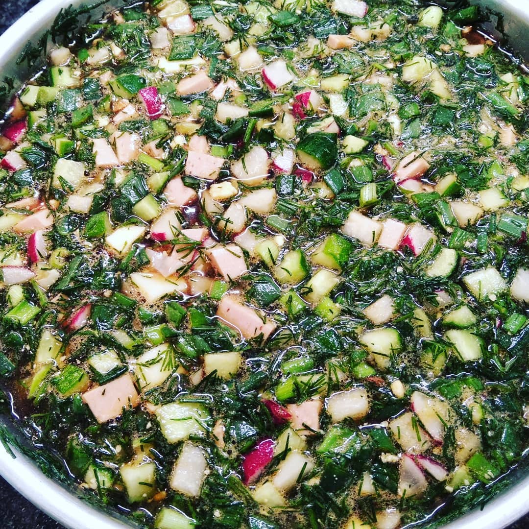 Колбаса, огурцы свежие, редис, лук зеленый, укроп, вареные яйца и килька (либо бычки) в томатном соусе. Ну и конечно квас. Все нарезать, кильку целиком выложить из банки вместе с соусом, посолить, залить квасом. Со сметаной либо с майонезом (кто как любит) ну ооочень вкусно, хотя не каждый поймет... Сообщение отредактировано Наташа: Aug 14 2020, 18:57 Вложенные эскизы изображений -------------------- Во всех непонятных ситуациях ложитесь спать...