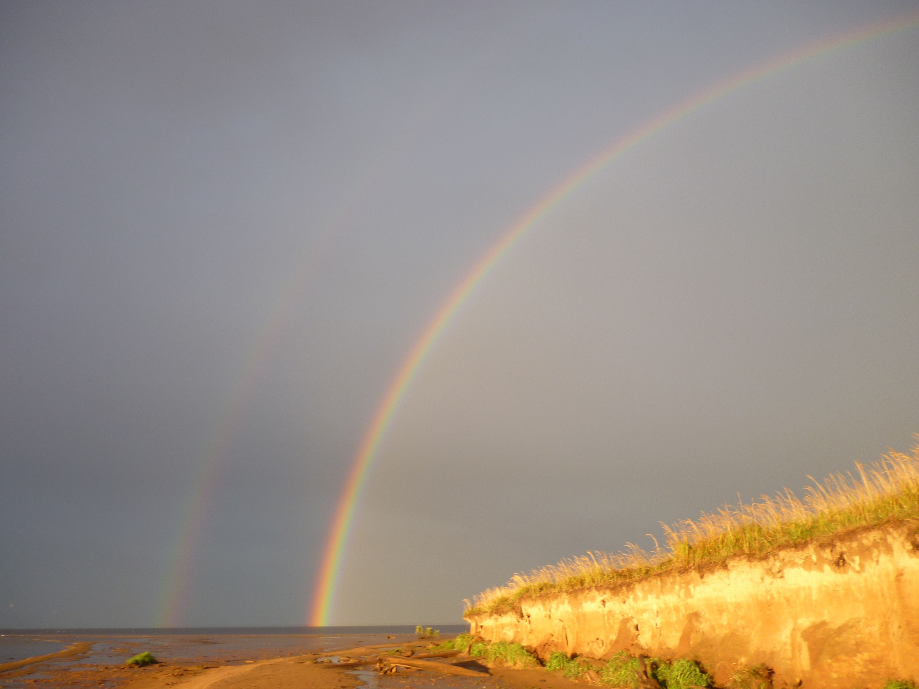 У меня однажды был случай,что радуга "упёрлась"одной стороной в дорогу.Всё так четко было видно.Успел доехать до этого места постоять на земле, внутри радуги.Было это года три назад.Помню что вокруг меня,было чётко различимых только три,или четыре цвета.Ощущение ни с чем не сравнимое.Быстро правда всё растворилось.Впечатление такое,будто вокруг тебя кто то поднял разноцветную изумрудную пыль.