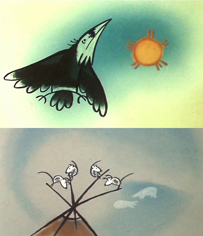 (северная сказка, тоже немного загадочная) Давно было. Кутх тогда уже мало летал. Больше пешком или на нартах с оленями ходил, человеком. А кухлянку ворона дома оставлял, в яранге. Мити, жена его, ленивая была. Ничего сама делать не хотела. Кутх придёт из тундры, мяса разного привезёт, рыбы, ягод, а она его юколой накормит и всё. Даже чай сварить не может. Спит целый день. И ночь тоже. В полярное лето никакой разницы нет, когда спать, всё равно светло. Надоело Кутху одну вяленую рыбу кушать. Однажды решил он проучить жену. Пришёл с охоты, разбудил Мити, отдал ей добычу и улёгся в яранге. — Не буду есть, — говорит. — Устал я. Совсем старый стал. Умру скоро. — Что ты, что ты! — испугалась Мити. — Не умирай, Куккэ! Без тебя как жить буду? — А как раньше жила — спать будешь. Совсем просыпаться перестанешь. Вот и догонишь меня у верхних людей. Сказал Кутх и закрыл глаза. Мити сидит рядом, плачет, сама не хочет умирать. Тогда Кутх говорит ей: — Иди, выкопай на сопке яму, неглубокую только. На дно мои нарты поставь и траву постели. Я лягу, кухлянкой укроюсь и умру. А ты потом навари толкуши, котлет наделай с кимчигой и сараной, чагу завари крепко. Приноси всё ко мне и сразу убегай, не оборачиваясь. Каждый день будешь так делать, тогда не уснёшь навсегда. — Хорошо, — сказала Мити. Обрадовалась, что умирать не надо. Побежала на сопку, всё сделала, как муж велел, и домой вернулась. Кутх покряхтел для виду, поднялся кое-как, кухлянку взял и ушёл на сопку. А Мити скорей варить начала. Наготовила еды всякой, отнесла мужу и бегом обратно. Кутх выбрался из-под кухлянки голодный сильно, уселся кушать скорей. Много съел, наелся уже, однако немножко котлет осталось, две с половиной штуки. Позвал тогда Кутх мышей: — Эй, внучатки, приходите в гости! Мыши услыхали его, запищали радостно. Бегут, хвостики свечкой — лапки потирают. Прибежали, наелись котлет, и давай у Кутха на животе скакать. Прыгают, кувыркаются, а ему щекотно до смеха. Хохотал он, хохотал, чуть не лопнул. Потом уснул крепко, укрывшись кухлянкой. И мыши с ним пригрелись, тоже спят. Так они жили долго, может, всё лето. Мити совсем сон забыла, — каждый день, поди-ка, сколько варить надо да ещё в тундру ходить за мясом и кореньями. А Кутх растолстел, что и в яме ему тесновато стало. Чуть мышей не придавил во сне. Все бока отлежал, да и ходить разучился. Надел он тогда свою кухлянку воронову и полетел домой. Прилетел, сел на кочку, кухлянку скинул. Позвал Мити. А она не узнала его, убежала к сыну Эмэмкуту. Тот выскочил из яранги, схватил хорей и давай Кутха по берегу реки гонять, дубасить. Хорошо ему бока намял. Кутх к вечеру, пока с сыном бегали, и похудел от такой встречи. Тут его все и узнали. — Как же ты ожил?! — обрадовалась Мити. А Эмэмкут ничего не сказал. Стоял только, рот открыв. И жена его рядом глазами лупает, как сова. — Верхние люди увидели, какая ты работящая стала, и отпустили меня, — ответил Кутх, почёсывая рёбра. — Только зря, видно. Но недолго он обижался, забыл скоро. Потому что Мити вкусно теперь варить научилась и совсем лениться перестала. Зажили они тогда снова — сыто да весело. Мыши только к ним поближе перебрались, в самую ярангу. Тоже привыкли вкусно кушать… Тут и сказочке конец, а кто прочёл — тот молодец! Вложенные эскизы изображений |