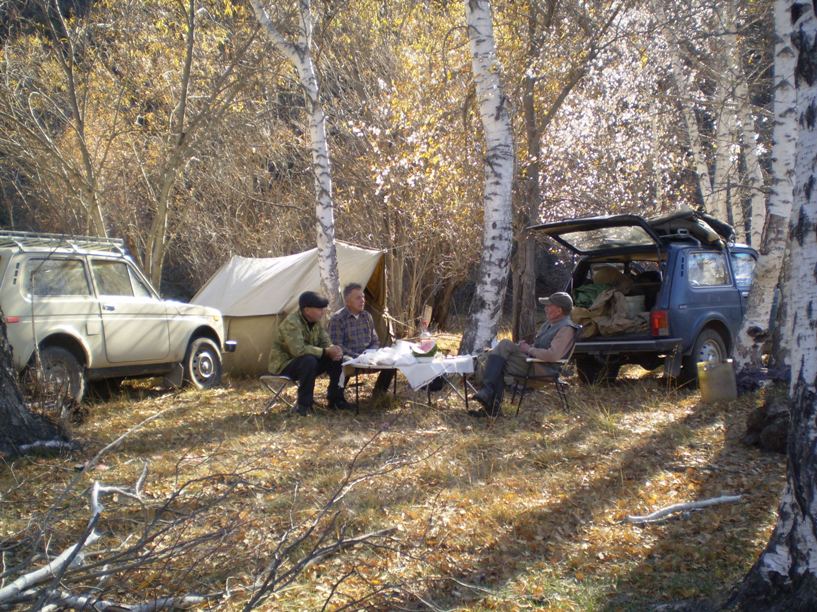 «На территории заказника запрещена промысловая и любительская охота, разведение костров…» Отец свернул влево и Лёня не успел дочитать строгий текст, которого раньше тут определённо «не стояло». В межгорной котловине едва заметный просёлок петлял вокруг высоких холмов, пересекал родники и болотца, сухие каменистые овраги и постепенно сошёл на нет, потерявшись в высокой траве, сулившей близкий берег долгожданной реки. Вот и строевой березняк, растянувшийся вдоль обширной плоской долины, подтвердил: прибыли! — Поехали в левый угол, — предложил отцу Лёня. — Помнишь, там хорошее местечко было под самой горой, вон за теми ивами, — он мотнул подбородком и добавил: — А лучше тормозни, я вылезу, пойду впереди, чтобы в яму или на камень не угодить. Он вышел из машины, вздохнул полной грудью, вскинул голову. День окончательно сдался. На ясное небо изморозью выпали звёзды — крупные калейдоскопом сложились в созвездия, а мелкие рассыпались алмазной пылью по всему чёрному шатру, сгущаясь посреди в санный Млечный Путь. Искрили гранями прямо в глаза, манили, звали к себе, но их зову вняла только полная Луна. Пока Лёня брёл сквозь траву в дальнем свете фар, она выкатилась из-за хребта и залила всю долину серебром, открыв взорам прибывших речку, с чуть приподнятыми над быстрым течением берегами. — Здравствуй, сударыня Речка, — прошептал Лёня, остановившись над обрывчиком. Машины елозили между деревьями позади него, устраиваясь на стоянку, замерли, потушили фары, и отец с Володей выбрались, наконец, из-за баранок, за ними и пассажиры, разминая затёкшие косточки. — Так, чего стоим, чего чешемся? — сходу напал на «молодого» Лёню Сергеичев. — Почему костра ещё нет, где ужин? Полчаса уже прохлаждаешься, а мы до сих пор ни в одном глазу?! Он сыпал громкими словами без остановки, — они катились по берегу, поверху над плеском воды, затихая на другом берегу, — а сам за бесшабашным разговором уже открыл нараспашку дверцы «Сузуки» и выгребал из её пропыленного нутра немудрёный походный скарб. Неуёмная энергия этого громадного мужика, по-крестьянски широкого костью и душой, тут же передалась его друзьям, и они споро распаковали пожитки из обеих машин: натянули две латаные брезентовые палатки, кинули в них овчинные тулупы, кошму и спальники, расставили походный стол и стульчики. Геннадий, на правах «старого волка» помог с установкой палаток и отправился перекурить на берег реки, в темноте выписывая на ходу огоньком сигареты замысловатые зигзаги. Николай, закончив с товарищами хозяйственные дела, безуспешно пытался поймать связь на мобильный телефон. Сергеичев подключил переносную фару от аккумулятора «Нивы» и, наладив видеокамеру, взял раздосадованного товарища «на мушку»: — Да не парься ты, Рыбалкин! Здесь тебе не переговорный пункт на почтамте, связи и на перевале никогда не бывало — так что, придётся твоей ненаглядной засыпать без «спокойной ночи»! — балагурил по ходу съёмки Виктор, затем переключился на обустройство вечернего походного «достархана», которым занялись Володя и Лёня. И вот уже под объективом камеры заиграл костёр оранжевыми языками пламени, в специально вырытом в дёрне, обвалованном закутке. А над ним, плотно устроившись на валунах сложенного на скорую руку очага, уже пыхтел паром из-под крышки закопчённый котелок. На столе появился бел