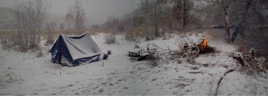 Очередным утром Лёня выпростал голову из спальника, из-под накинутой палатки и захлебнулся воздухом, звенящим от мороза, и снегом, посыпавшимся на лицо. За ночь их «лежбище», берег ручья и распадки меж скалистыми вершинами замело пургой. И хотя рассвет только-только лизнул небо на востоке розовым языком зари, вокруг было светло под звёздным стягом Млечного пути и Луной, словно белой северной ночью. Ивовый куст разлаписто чернел над головой, скалы острыми зубьями выпирали из заснеженных склонов и промёрзшие машины серебрились заиндевевшими боками у чёрного пепелища потухшего костра.